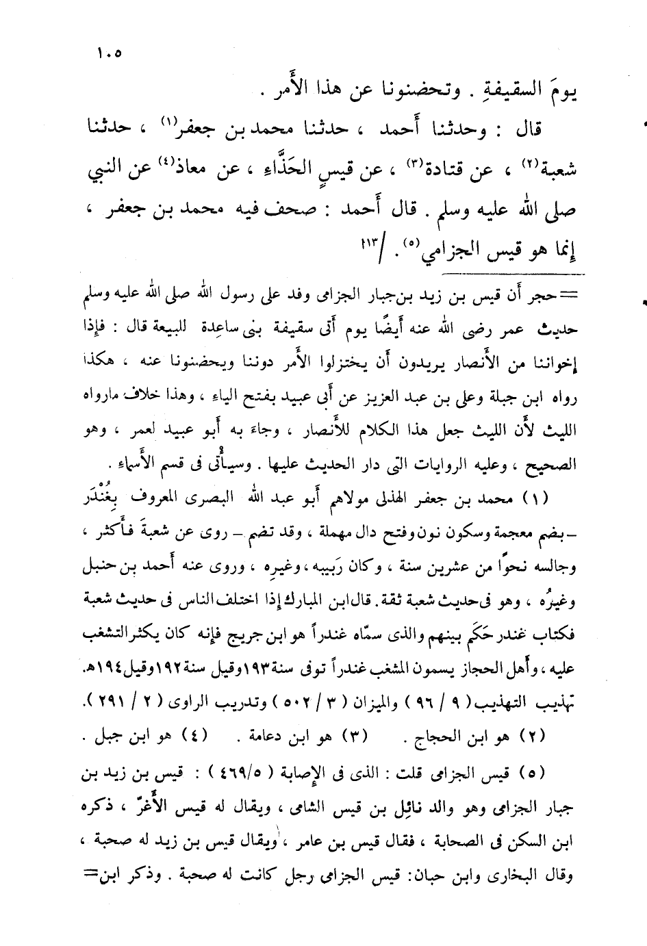 يَوْم السَّقِيفَة وتحضنونا عَنْ هَذَا الأَمْرِ قَالَ وَحَدَّثَنَا أَحْمَدُ حَدَّثَنَا مُحَمَّدُ بْنُ جَعْفرٍ حَدَّثَنَا شُعْبَةُ عَنْ قَتَادَةَ عَنْ قَيْسٍ الْحَذَّاءِ عَنْ مُعَاذٍ عَنِ النَّبِيَّ صَلَّى اللَّهُ عَلَيْهِ وَسَلَّمَ قَالَ أَحْمَدُ صَحَّفَ فِيهِ مُحَمَّدُ بْنُ جَعْفَرٍ إِنَّمَا هُوَ قَيْسٌ الجزامي 13 أ