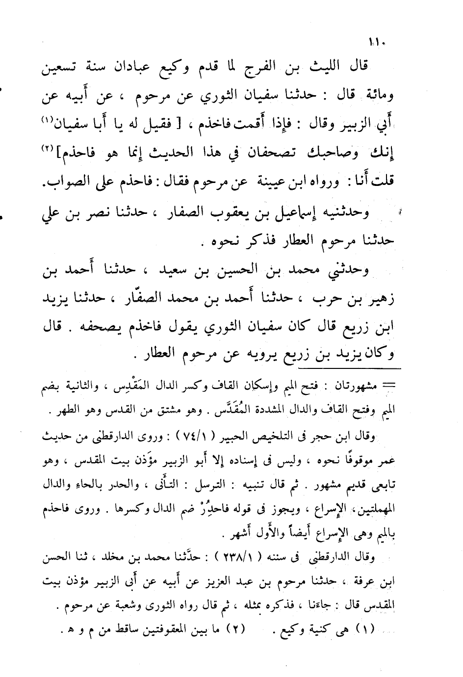 قَالَ اللَّيْثُ بْنُ الْفَرَجِ لَمَّا قدم وَكِيع عبادان سَنَةَ تِسْعِينَ وَمِائَةٍ قَالَ حَدَّثَنَا سُفْيَانُ الثَّوْرِيُّ عَنْ مَرْحُومٍ عَنْ أَبِيه عَنْ أَبِي الزُّبَيْرِ وَقَالَ فَإِذَا أَقمت فاخذم [فَقِيلَ لَهُ يَا أَبَا سُفْيَانَ إِنَّكَ وَصَاحِبَكَ تُصَحِّفَانِ فِي هَذَا الْحَدِيثِ إِنَّمَا هُوَ فَاحْذَمْ] قُلْتُ أَنَا وَرَوَاهُ ابْنُ عُيَيْنَةَ عَنْ مَرْحُومٍ فَقَالَ فَاحْذَمْ عَلَى الصَّوَابِ