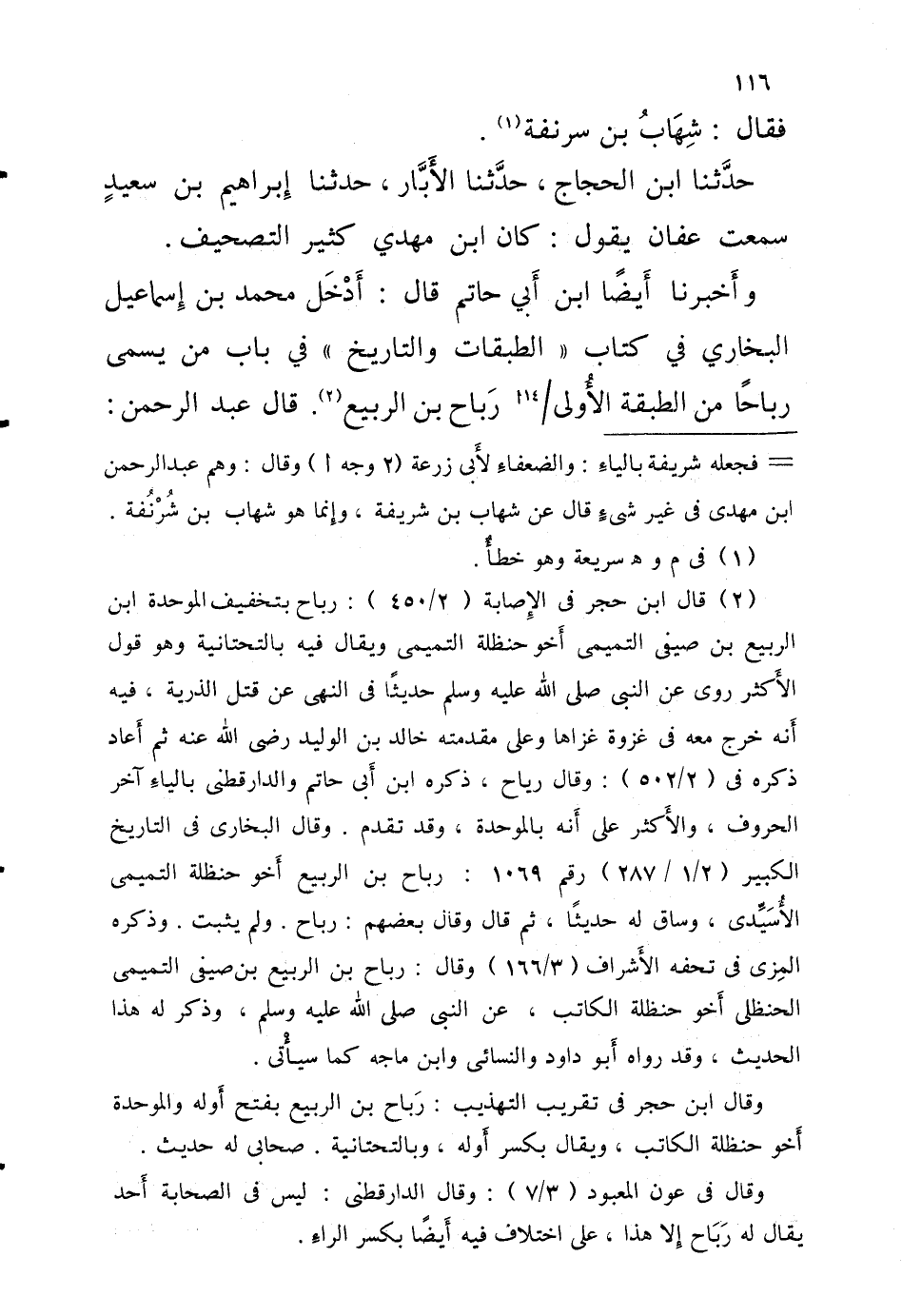 وَأَخْبَرَنَا أَيْضًا ابْنُ أَبِي حَاتِمٍ قالَ أَدْخَل مُحَمَّدُ بْنُ إِسْمَاعِيلَ الْبُخَارِيُّ فِي كِتَابِ الطَّبَقَات والتاريخ فِي بَابُ مَنْ يُسمى رباحا من الطَّبَقَة الأولى 14 أرَبَاح بْن الرَّبِيع قالَ عَبْد الرَّحْمَن