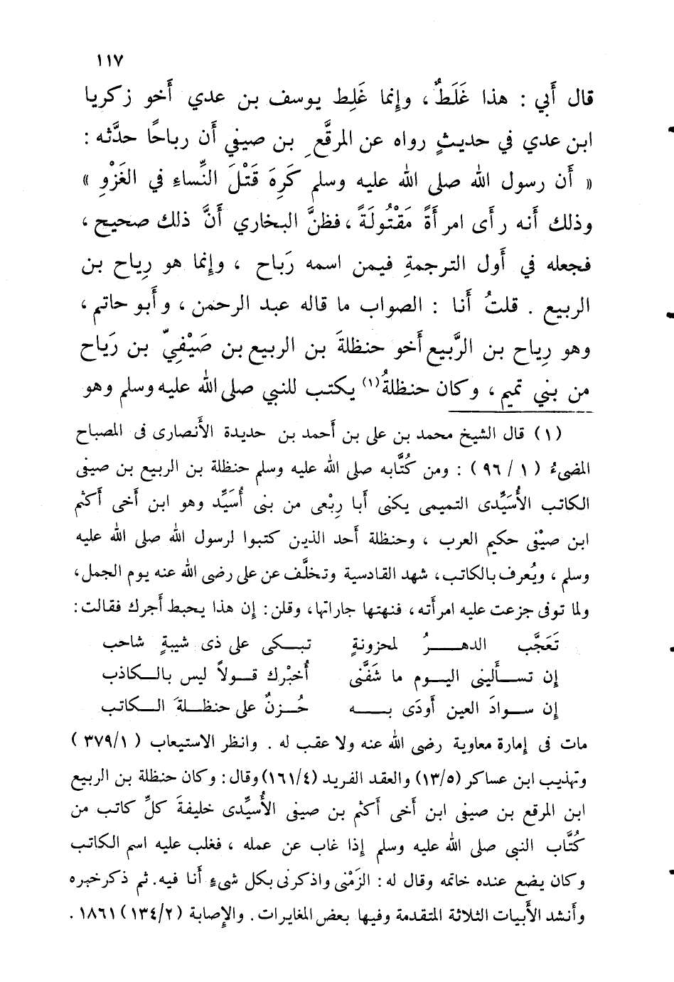 قَالَ أَبي هَذَا غلط وإِنما غلط يُوسُف بْن عدي أَخو زَكَرِيَّا ابْن عدي فِي حَدِيث رَوَاه عَن المرقَّعِ بْن صَيْفِي أَن رباحًا حدَّثه أَن رَسُول اللَّهِ صَلَّى اللَّهُ عَلَيْهِ وَسَلَّمَ كَرِهَ قَتْلَ النِّساءِ فِي الغَزْوِ وَذَلِكَ أنَّه رأَى امرأَةً مَقْتُولَةً فظنَّ الْبُخَارِيّ أَنَّ ذَلِك صَحِيح فَجعله فِي أول التَّرْجَمَة فِيمَن اسْمه رَبَاح وإِنما هُوَ رياحِ بْن الرَّبيع قلتُ أَنا الصَّوَاب مَا قَالَه عَبْد الرَّحْمَن وَأَبُو حَاتِم وَهُوَ ريَاح بْن الرَّبيع أَخو حَنْظَلَة بْن الرَّبِيع بْن صَيْفيّ بن رَياح مَنْ بني تَمِيم وَكَانَ حَنْظَلَة يكْتب للنَّبِي صَلَّى اللَّهُ عَلَيْهِ وَسَلَّمَ وَهُوَ