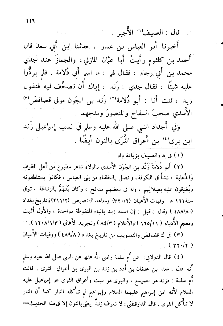 وَفِي أَجداد النَّبِيّ صلى الله عَلَيْهِ وَسلم فِي نسب إِسْمَاعِيل زند ابْن بري بْن أَعراق الثَّرَى بالنُّون أَيضًا