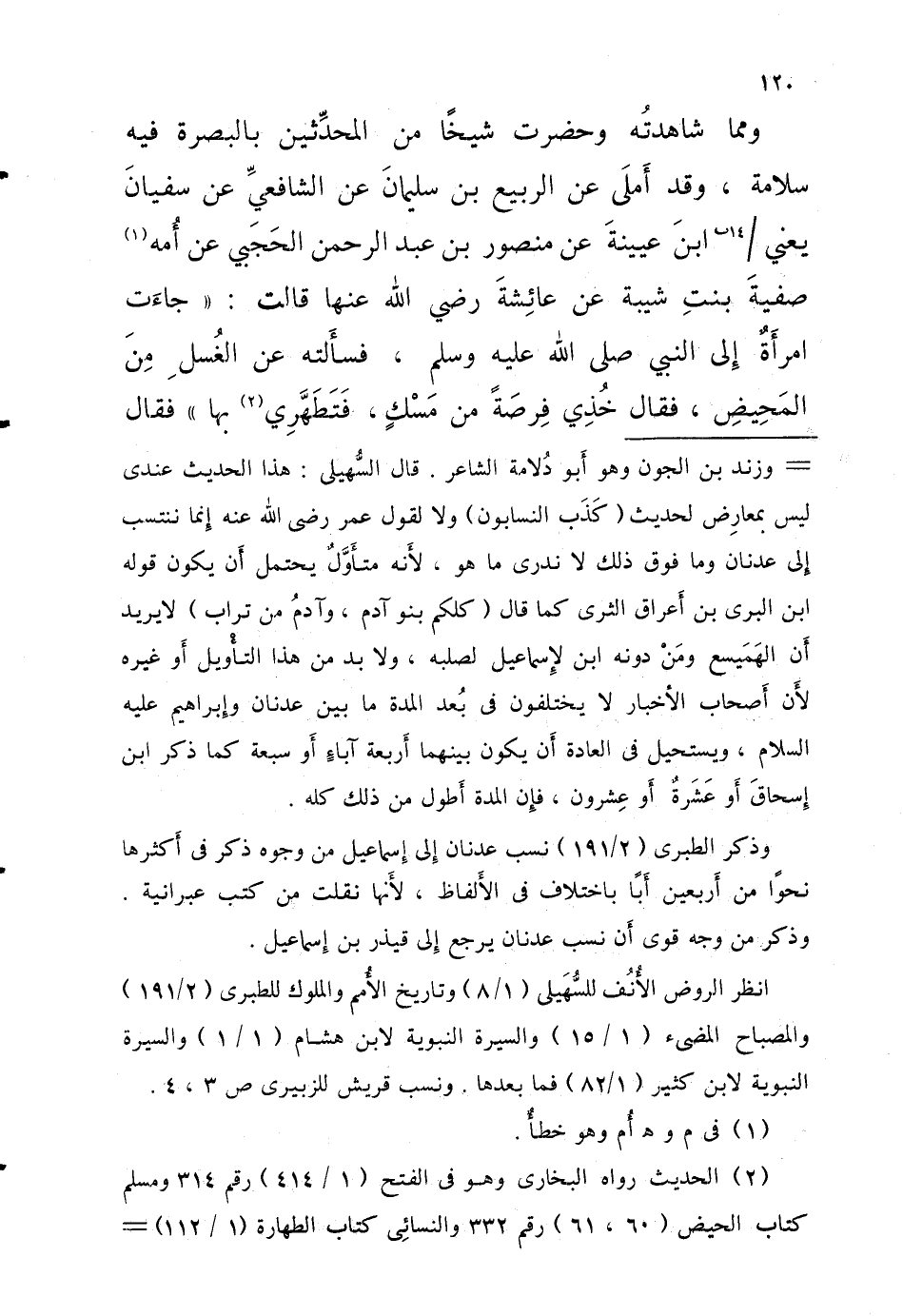 وَمِمَّا شَاهَدْتُهُ وَحَضَرْتُ شَيْخًا مِنَ الْمُحَدِّثِينَ بِالْبَصْرَةِ فِيهِ سَلامَةُ وَقَدْ أَمْلَى عَنِ الرَّبِيعِ بْنِ سُلَيْمَانَ عَن الشَّافِعِي عَن سُفْيَان يَعْنِي 14 ب ابْنَ عُيَيْنَةَ عَنْ مَنْصُورِ بْنِ عَبْدِ الرَّحْمَنِ الْحَجَبِيِّ عَنْ أُمِّهِ صَفِيَّةَ بِنْتِ شَيْبَةَ عَنْ عَائِشَةَ رَضِيَ اللَّهُ عَنْهَا قَالَتْ جَاءَتِ امْرَأَةٌ إِلَى النَّبِيِّ صَلَّى اللَّهُ عَلَيْهِ وَسَلَّمَ فَسَأَلَتْهُ عَنِ الْغُسْلِ مِنَ الْمَحِيضِ فَقَالَ خُذِي فِرْصَةً مِنْ مِسْكٍ فَتَطَهَّرِي بِهَا فَقَالَ
