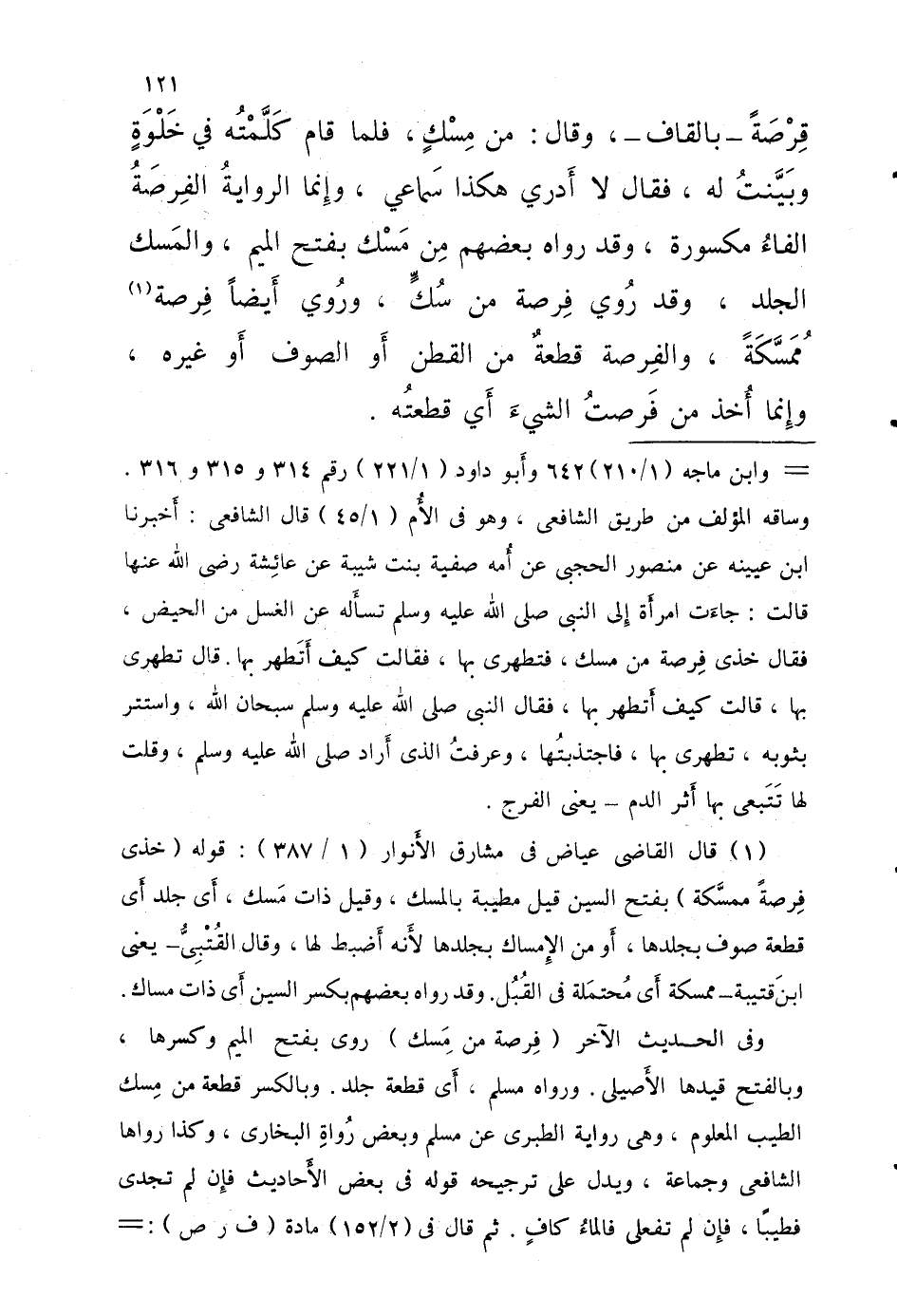 قِرْصَةً بِالْقَافِ وَقَالَ مِنْ مِسْكٍ فَلَمَّا قَامَ كَلَّمْتُهُ فِي خَلْوَةٍ وَبَيَّنْتُ لَهُ فَقَالَ لَا أَدْرِي هَكَذَا سَمَاعِي وَإِنَّمَا الرِّوَايَةُ الْفِرْصَةُ الْفَاءُ مَكْسُورَةٌ وَقَدْ رَوَاهُ بَعْضُهُمْ مِنْ مِسْكٍ بِفَتْحِ الْمِيمِ وَالْمِسْكُ الْجِلْدُ وَقَدْ رُوِيَ فِرَصَةً مِنْ سُكٍّ وَرُوِيَ أَيْضًا فِرْصَةً مُمَسِّكَةً وَالْفِرْصَةُ قِطْعَةٌ مِنَ الْقُطْنِ أَوِ الصُّوفِ أَوْ غَيْرِهِ وَإِنَّمَا أُخِذَ مِنْ فَرَصْتُ الشَّيْءَ أَيْ قَطَعْتُهُ