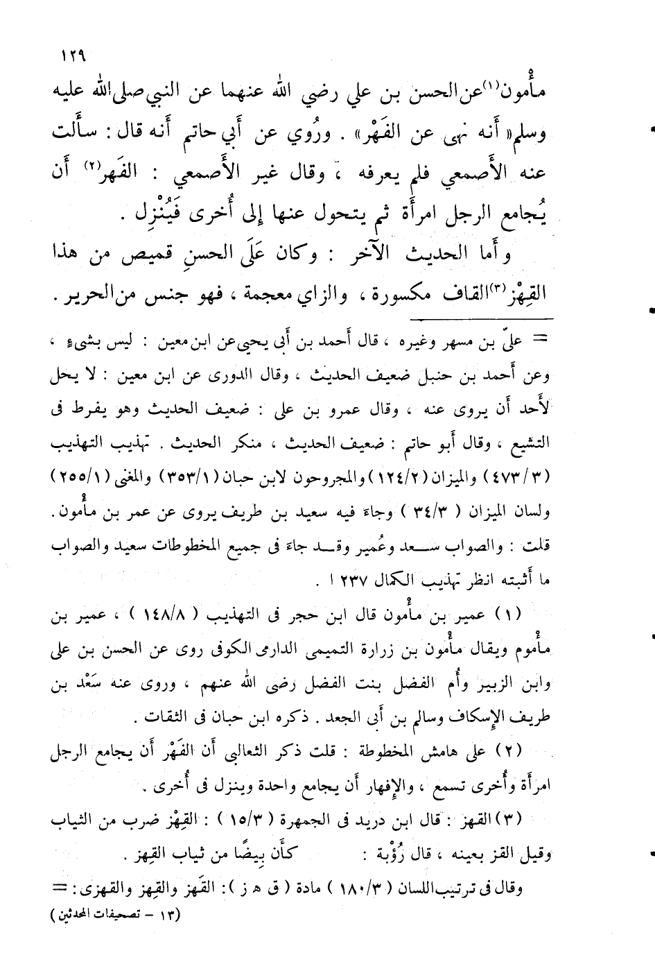مَأْمُونٍ عَنِ الْحَسَنِ بْنِ عَلِيٍّ رَضِيَ اللَّهُ عَنْهُمَا عَنِ النَّبِيِّ صَلَّى اللَّهُ عَلَيْهِ وَسَلَّمَ أَنَّهُ نَهَى عَنِ الْفَهْرِ وَرُوِيَ عَنْ أَبِي حَاتِمٍ أَنَّهُ قَالَ سَأَلْتُ عَنْهُ الأَصْمَعِيَّ فَلَمْ يَعْرِفْهُ وَقَالَ غَيْرُ الأَصْمَعِيِّ الْفَهْرُ أَنْ يُجَامِعَ الرُّجُلُ امْرَأَةً ثُمَّ يَتَحَوَّلُ عَنْهَا إِلَى أُخْرَى فَيُنْزِلُ