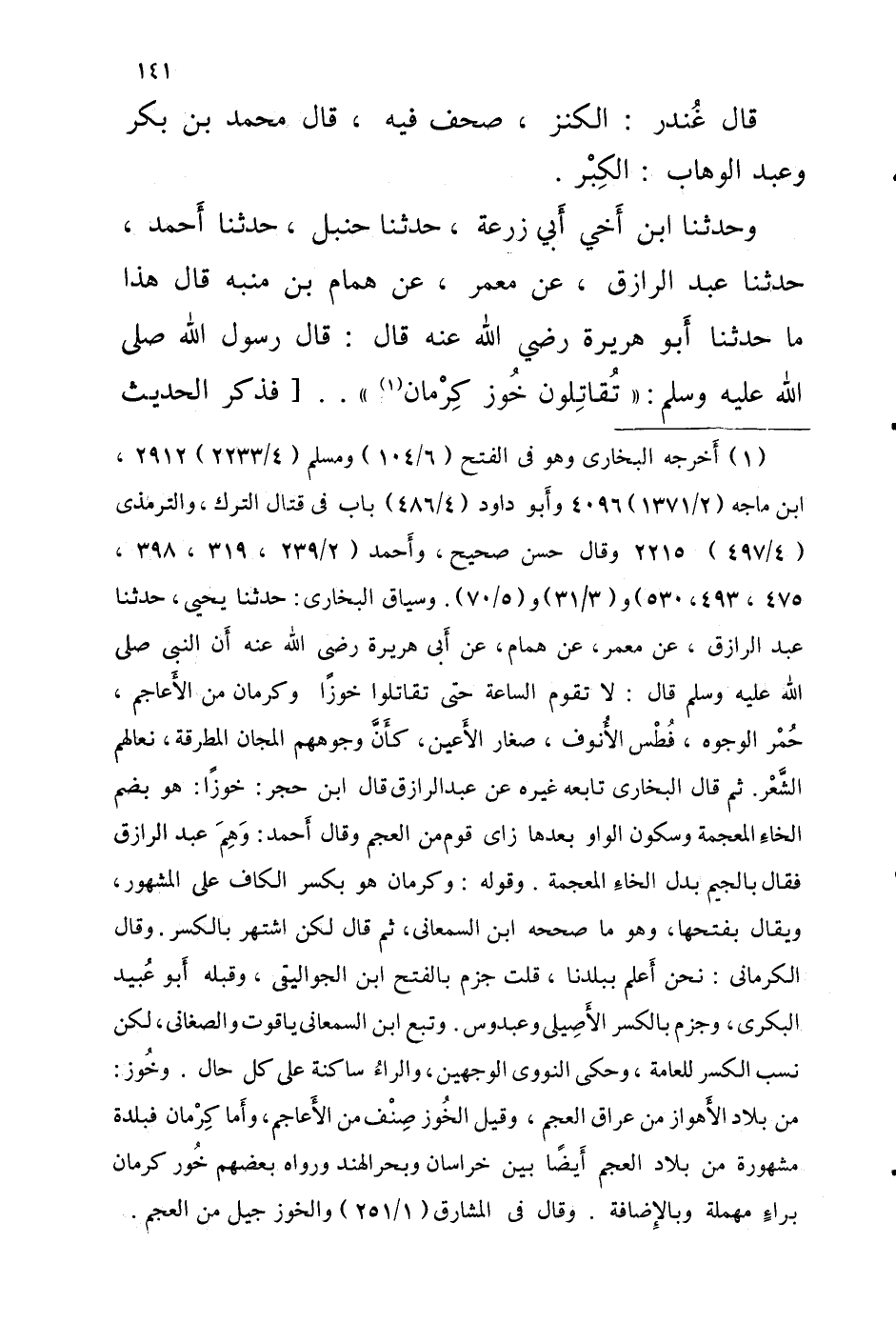 وَحَدَّثَنَا ابْنُ أَخِي أَبِي زُرْعَةَ حَدَّثَنَا حَنْبَلٌ حَدَّثَنَا أَحْمَدُ حَدَّثَنَا عبد الرازق عَن معمر عَن همام بْن منبة قالَ هَذَا مَا حَدَّثَنَا أَبُو هُرَيْرَةَ رَضِيَ اللَّه عَنْهُ قَالَ قَالَ رَسُول اللَّهِ صَلَّى الله عَلَيْهِ وَسلم تُقاتِلون خُوز كِرْمان [فَذكر الحَدِيث