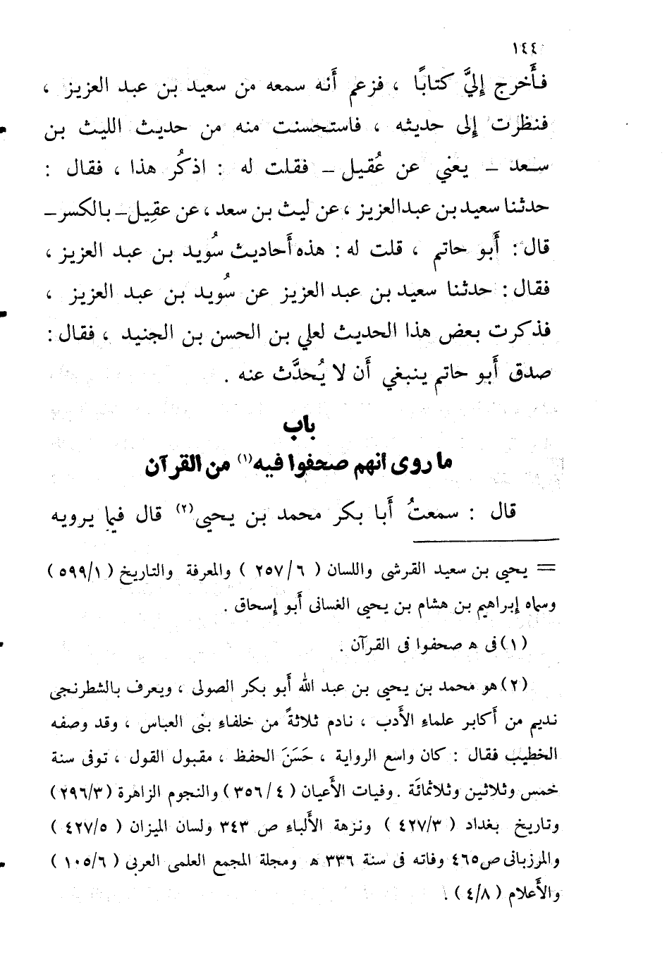 - بَابُ مَا روى أَنهم صحفوا فِيهِ مَنِ الْقُرْآن قالَ سمعتُ أَبَا بَكْر مُحَمَّد بْن يحيى قَالَ فِيمَا يرويهِ