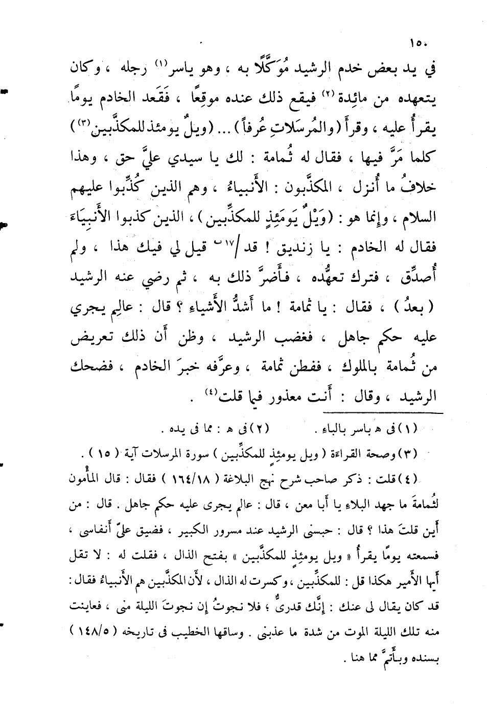 فِي يَد بعض خدم الرشيد مُوَكَّلًا بِهِ وَهُوَ يَاسر رجله وَكَانَ يتعهده مَنْ مائِدة فَيَقَع ذَلِك عِنْده موقِعًا فَقَعد الْخَادِم يَوْمًا يقرأُ عَلَيْهِ وقرأَ (والْمُرسَلاتِ عُرفًا) (ويلٌ يَوْمئِذٍ للمكذَّبين) كلما مَرَّ فِيهَا فَقَالَ لَهُ ثُمامة لَك يَا سَيِّدي عليَّ حق وَهَذَا خلافُ مَا أُنزل المكذَّبون الأنبياءُ وهم الَّذين كُذِّبوا عَلَيْهِم السَّلَام وإِنما هُوَ (وَيْلٌ يَوْمَئِذٍ للمكذبين) الَّذين كذبُوا الأنبياءَ فَقَالَ لَهُ الْخَادِم يَا زنديق 17 ب قيل لي فِيك هَذَا وَلم أُصدِّق فَترك تعهُّده فأَضرَّ ذَلِك بِهِ ثُمَّ رَضِيَ عَنْهُ الرشيد (بعدُ) فَقَالَ يَا ثُمَامَة مَا أَشدُّ الأَشياءِ قالَ عالِم يجْرِي عَلَيْهِ حكم جَاهِل فَغَضب الرشيد وَظن أَن ذَلِك تَعْرِيض مَنْ ثُمامة بالملوك فَفطن ثُمَامَة وعرَّفه خبرَ الْخَادِم فَضَحِك الرشيد وَقَالَ أَنت مَعْذُور فِيمَا قلتُ