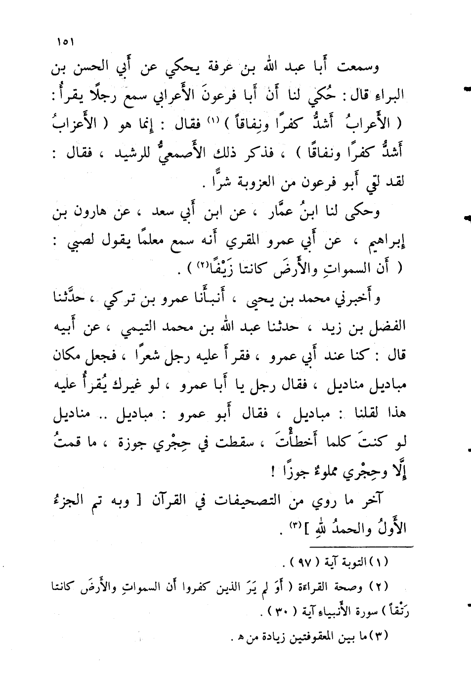 آخر مَا رُوِيَ مَنِ التصحيفات فِي الْقُرْآن [وَبِه تمّ الجزءُ الأَولُ والحمدُ للهِ]