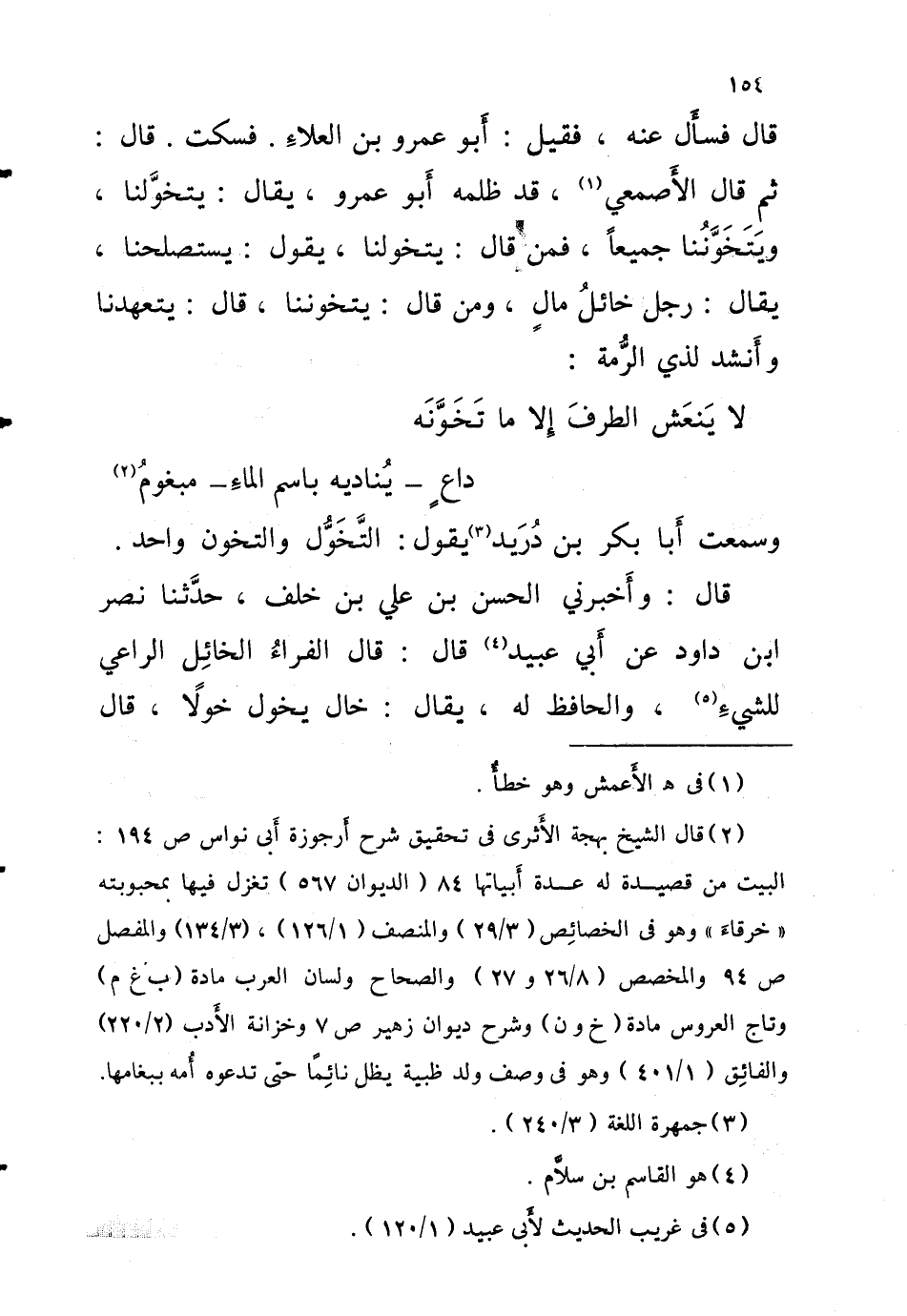 قَالَ فَسَأَلَ عَنْهُ فَقِيلَ أَبُو عَمْرِو بْنُ الْعَلاءِ فَسَكَتَ قَالَ ثُمَّ قَالَ الأَصْمَعِيُّ قَدْ ظَلَمَهُ أَبُو عَمْرٍو يُقَالُ يَتَخَوَّلُنَا وَيَتَخَوَّنُنَا جَمِيعًا فَمَنْ قَالَ يَتَخَوَّلُنَا يَقُولُ يَسْتَصْلِحُنَا يُقَالُ رَجُلٌ خَائِلُ مَالٍ وَمَنْ قَالَ يَتَخَوَّنُنَا قَالَ يَتَعَهَّدُنَا وَأَنْشَدَ لِذِي الرُّمَةِ