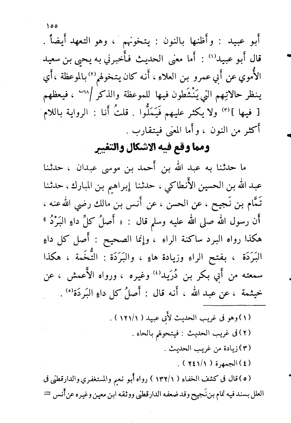 أَبُو عُبَيْد وأَظنها بالنُّون يتخونهم وَهُوَ التعهد أَيْضا قالَ أَبُو عُبَيْد أَما معنى الحَدِيث فأَخبرني بِهِ يحيى بْن سَعِيد الأُموي عَن أَبِي عَمْرو بْن العلاءِ أَنه كَانَ يتخولهم بِالْمَوْعِظَةِ أَي ينظر حالاتِهم الَّتِي يَنَْشَطون فِيهَا للموعظة وَالذكر 18 ب فيعظهم [فِيهَا] وَلَا يكثر عَلَيْهِم فَيَمَلُّوا قلتُ أَنا الرِّوَايَة بِاللَّامِ أَكثر مَنِ النُّون وأَما الْمَعْنى فيتقارب وَمِمَّا وَقع فِيهِ الْإِشْكَال والتغيير مَا حَدَّثَنَا بِهِ عَبْدُ اللَّهِ بْنُ أَحْمَدَ بْنِ مُوسَى عَبْدَانَ حَدَّثَنَا عَبْدُ اللَّهِ بْنُ الْحُسَيْنِ الأَنْطَاكِيُّ حَدَّثَنَا إِبْرَاهِيمُ بْنُ الْمُبَارَكِ حَدَّثَنَا تَمَّامُ بْنُ نَجِيحٍ عَنِ الْحَسَنِ عَنْ أَنَسِ بْنِ مَالِكٍ رَضِيَ اللَّهُ عَنْهُ أَنّ رَسُولِ اللَّهِ صَلَّى اللَّهُ عَلَيْهِ وَسَلَّمَ قَالَ أَصْلُ كُلِّ دَاءٍ الْبرد هَكَذَا رَوَاهُ الْبَرْدُ سَاكِنَةَ الرَّاءِ وَإِنَّمَا الصَّحِيحُ أَصْلُ كُلِّ دَاءٍ الْبَرَدَةُ بِفَتْحِ الرَّاءِ وَزِيَادَةِ هَاءٍ وَالْبَرَدَةُ التُّخْمَةُ هَكَذَا سَمِعْتُهُ مِنْ أَبِي بَكْرِ بْنِ دُرَيْدٍ وَغَيْرِهِ وَرَوَاهُ الْأَعْمَشُ عَنْ خَيْثَمَةَ عَنْ عَبْدِ اللَّهِ أَنَّهُ قَالَ أَصْلُ كُلِّ دَاءٍ الْبَرَدَةُ