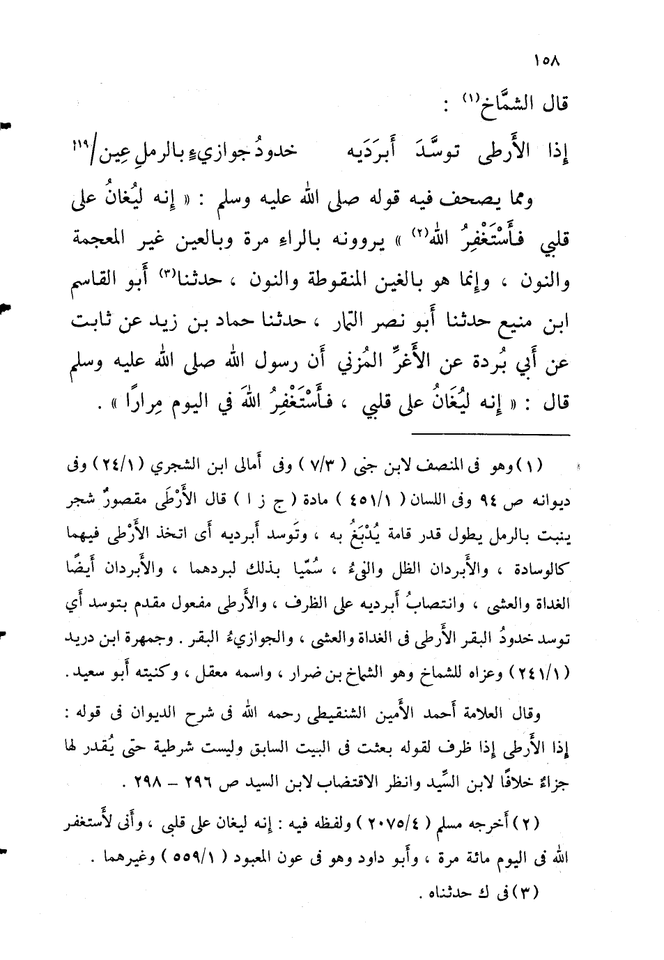 وَمِمَّا يُصَحَّفُ فِيهِ قَوْلِهِ صَلَّى اللَّهُ عَلَيْهِ وَسَلَّمَ إِنَّهُ لَيُغَانُ عَلَى قَلْبِي فَأَسْتَغْفِرُ اللَّهَ يَرْوُونَهُ بِالرَّاءِ مَرَّةً وَبِالْعَيْنِ غَيْرِ الْمُعْجَمَةِ وَالنُّونِ وَإِنَّمَا هُوَ بِالْغَيْنِ الْمَنْقُوطَةِ وَالنُّونِ حَدَّثَنَا أَبُو الْقَاسِم ابْن مَنِيعٍ حَدَّثَنَا أَبُو نَصْرٍ التَّمَّارُ حَدَّثَنَا حَمَّادُ بْنُ زَيْدٍ عَنْ ثَابِتٍ عَنْ أَبِي بُرْدَةَ عَنِ الأَغَرِّ الْمُزَنِيِّ أَنّ رَسُولَ اللَّهِ صَلَّى اللَّهُ عَلَيْهِ وَسَلَّمَ قَالَ إِنَّهُ لَيُغَانُ عَلَى قَلْبِي فَأَسْتَغْفِرُ الله ي الْيَوْمِ مِرَارًا