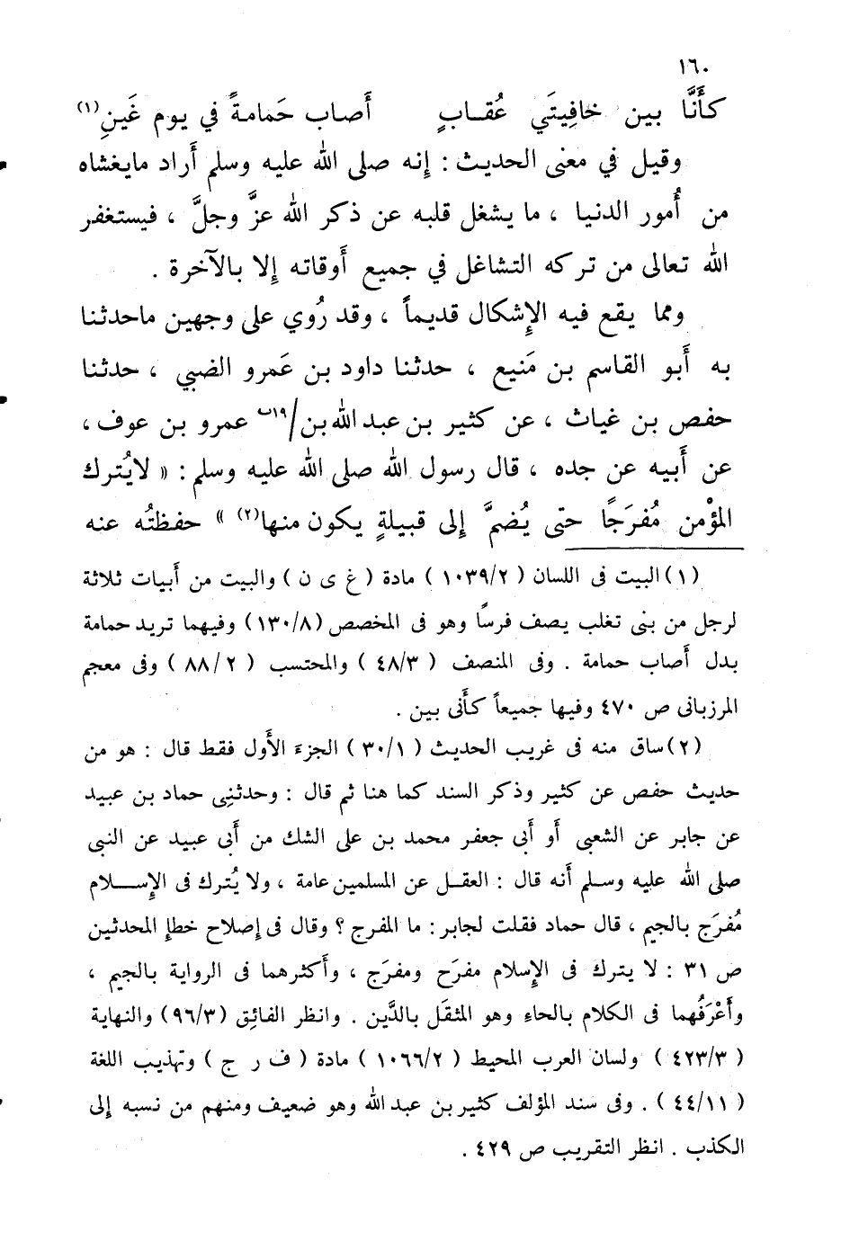 وَمِمَّا يَقع فِيهِ الإِشكال قَدِيما وَقد رُوي عَلَى وَجْهَيْن مَا حَدَّثَنَا بِهِ أَبُو الْقَاسِمِ بْنُ مَنِيعٍ حَدَّثَنَا دَاوُدُ بْنُ عَمْرٍو الضَّبِّيُّ حَدَّثَنَا حَفْصُ بْنُ غِيَاثٍ عَنْ كَثِيرِ بن عبد الله بن 19 ب عَمْرِو بْنِ عَوْفٍ عَنْ أَبِيهِ عَنْ جَدِّهِ قَالَ رَسُولُ اللَّهِ صلى الله عَلَيْهِ وسل لَا يُتْرَكُ الْمُؤْمِنُ مُفْرَجًا حَتَّى يُضَمَّ إِلَى قَبِيلَةٍ يَكُونُ مِنْهَا حفظتُه عَنْهُ