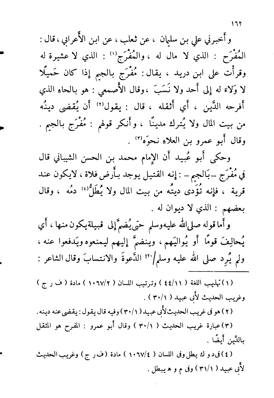 وَأَخْبرنِي عَليّ بْن سُلَيْمَان عَن ثَعْلَب عَن ابْن الْأَعرَابِي قالَ الْمُفْرَح الَّذِي لَا مَال لَهُ والْمُفْرَج الَّذِي لَا عشيرة لَهُ وقرأت عَلَى ابْن دُرَيْد يُقَالُ مُفْرَج بِالْجِيم إِذا كَانَ حَميلًا لَا وَلاءَ لَهُ إِلَى أحد وَلَا نَسَبَ وَقَالَ الْأَصْمَعِي هُوَ بالحاءِ الَّذِي أفرحه الدّين أَي أثقله قالَ يَقُول أَن يُقضى دينُه مَنْ بَيت المَال وَلَا يُترك مدينا وَأنكر قَوْلهم مُفْرَج بِالْجِيم وَقَالَ أَبُو عَمْرو بْن العلاءِ نحوَه