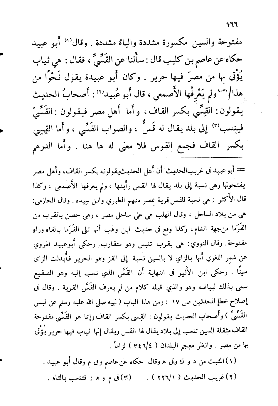 مَفْتُوحَةٌ وَالسِّينُ مَكْسُورَةٌ مُشَدَّدَةٌ وَالْيَاءُ مُشَدَّدَةٌ وَقَالَ أَبُو عُبَيْدٍ حَكَاهُ عَنْ عَاصِمِ بْنِ كُلَيْبٍ قَالَ سَأَلْنَا عَنِ القَسِّيِّ فَقَالَ هِيَ ثِيَابٌ يُؤْتَى بِهَا مِنْ مِصْرَ فِيهَا حَرِيرٌ وَكَانَ أَبُو عُبَيْدة يَقُول نَحوا من هَذَا 20 ب وَلم يعرفهَا الْأَصْمَعِي قالَ أَبُو عُبَيْد أَصحابُ الحَدِيث يَقُولُونَ القِسِّي بِكَسْر الْقَاف وَأما أهل مصر فَيَقُولُونَ القسي فينسب الى بلد يُقَال لَهُ قس وَالصَّوَاب القسي وَأما القِسِي بِكَسْر الْقَاف فَجمع الْقوس فَلَا معنى لَهُ هَا هُنَا وأَما الدِّرْهَم