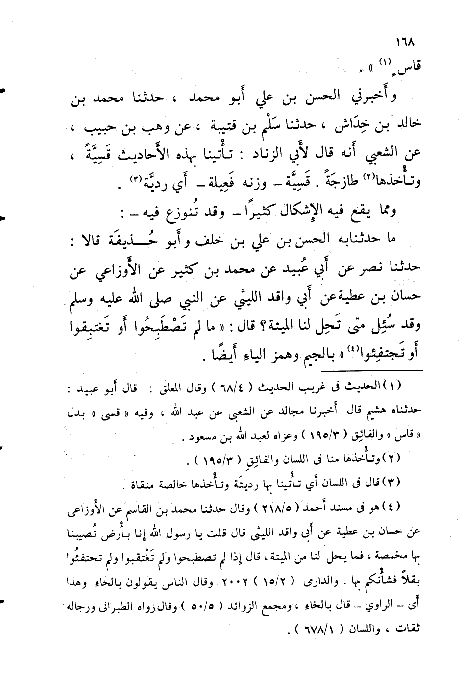 وَأَخْبرنِي الْحَسَن بْن عَليّ أَبُو مُحَمَّد حَدَّثَنَا مُحَمَّد بْن خَالِد بْن خِداش حَدَّثَنَا سَلْم بْن قُتَيْبَة عَن وهب بْن حبيب عَن الشَّعْبِيّ أنَّه قالَ لأبي الزِّنَاد تأْتينا بِهَذِهِ الْأَحَادِيث قسية وتأخدها طازجَةً قَسِيَّة وَزنه فَعِيلة أَي ردية