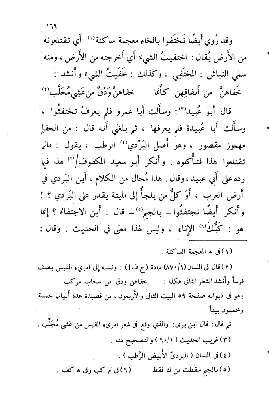 قالَ أَبُو عُبَيْد وَسَأَلت أَبَا عُمَرو فَلم يعرف تختفئُوا وَسَأَلت أَبَا عُبَيْدَة فَلم يعرفهَا ثُمَّ بَلغنِي أنَّه قالَ مَنِ الحفأ مَهْمُوز مَقْصُور وَهُوَ أصل البَرْدي الرطب يَقُول مَا لم تقتلعوا هَذَا فتأْكلوه وأَنكر أَبو سعيد المكفوف 21 أهَذَا فِيمَا رده عَلَى أَبِي عُبَيْد وَقَالَ هَذَا مُحال مَنِ الْكَلَام أَيْنَ البَردي فِي أَرض الْعَرَب أَوَ كلُّ مَنْ يلجأُ إِلَى الْميتَة يقدر عَلَى البَردي وَأنكر أَيْضا تجتفئُوا بِالْجِيم قالَ أَيْنَ الاجتفاءُ إِنما هُوَ كَبُّكَ الإِناءِ وَلَيْسَ لهَذَا معنى فِي الحَدِيث وَقَالَ