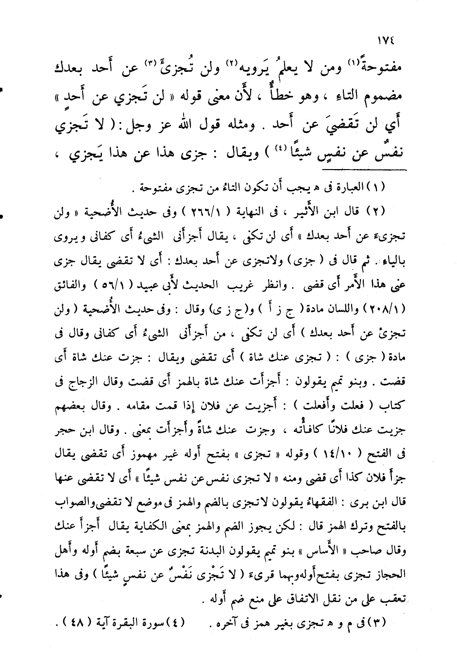 مَفْتُوحَة وَمن لَا يعلم يرويهِ وَلنْ تجزىء عَنْ أَحَدٍ بَعْدَكَ مَضْمُومُ التَّاءِ وَهُوَ خَطَأٌ لأَنَّ مَعْنَى قَوْلِهِ لَنْ تَجْزِيَ عَنْ أَحَدٍ أَيْ لَنْ تَقْضِيَ عَنْ أَحَدٍ وَمِثْلُهُ قَوْلِ اللَّهِ عَزَّ وَجَلَّ (لَا تَجْزِي نَفْسٌ عَنْ نَفْسٍ شَيْئًا) وَيُقَالُ جَزَى هَذَا عَنْ هَذَا يَجْزِي