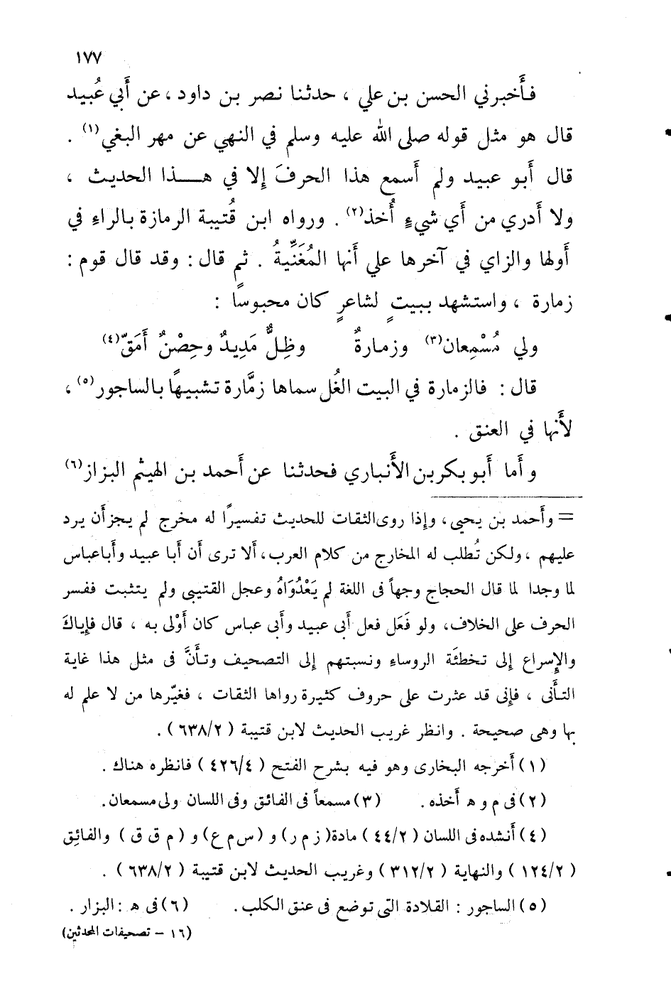 فَأََْخَبَرَنِي الْحَسَنُ بْنُ عَلِيٍّ حَدَّثَنَا نصر بْن دَاوُد عَن أَبِي عُبَيْدٍ قَالَ هُوَ مِثْلُ قَوْلِهِ صَلَّى اللَّهُ عَلَيْهِ وَسَلَّمَ فِي النَّهْيِ عَنْ مَهْرِ الْبَغِيِّ قالَ أَبُو عُبَيْد وَلم أسمع هَذَا الحرفَ إِلَّا فِي هَذَا الحَدِيث وَلَا أَدْرِي مَنْ أَي شيءٍ أَخذ وَرَوَاهُ ابْن قُتيبة الرمازة بالراءِ فِي أَولها وَالزَّاي فِي آخرهَا عَلَى أَنَّهَا الْمُغَنِّيةُ ثُمَّ قالَ وَقد قالَ قوم زمارة وَاسْتشْهدَ ببيتٍ لشاعرٍ كَانَ مَحْبُوسًا