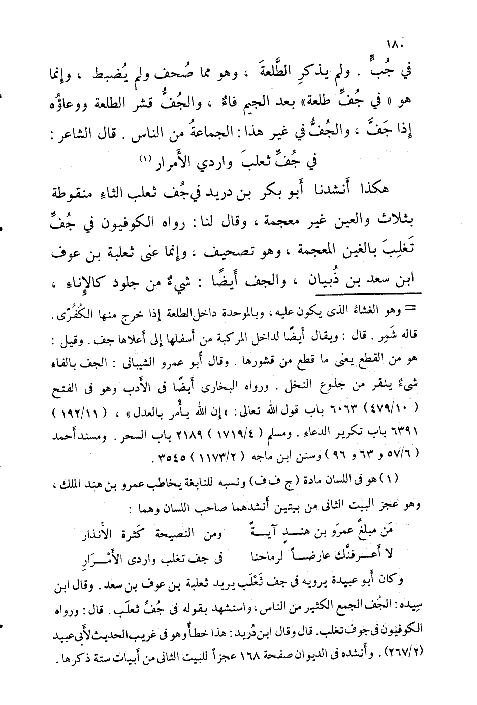هَكَذَا أنشدنا أَبُو بَكْر بْن دُرَيْد فِي جف ثَعْلَب الثاءُ منقوطة بِثَلَاث وَالْعين غير مُعْجمَة وَقَالَ لنا رَوَاه الْكُوفِيُّونَ فِي جف تغلب بالغين الْمُعْجَمَة وَهُوَ تَصْحِيف وإِنما عَنى ثَعْلَبَة بن عَوْف ابْن سعد بْن ذبيان والجف أَيْضا شيءٌ مَنْ جُلُود كالإناءِ