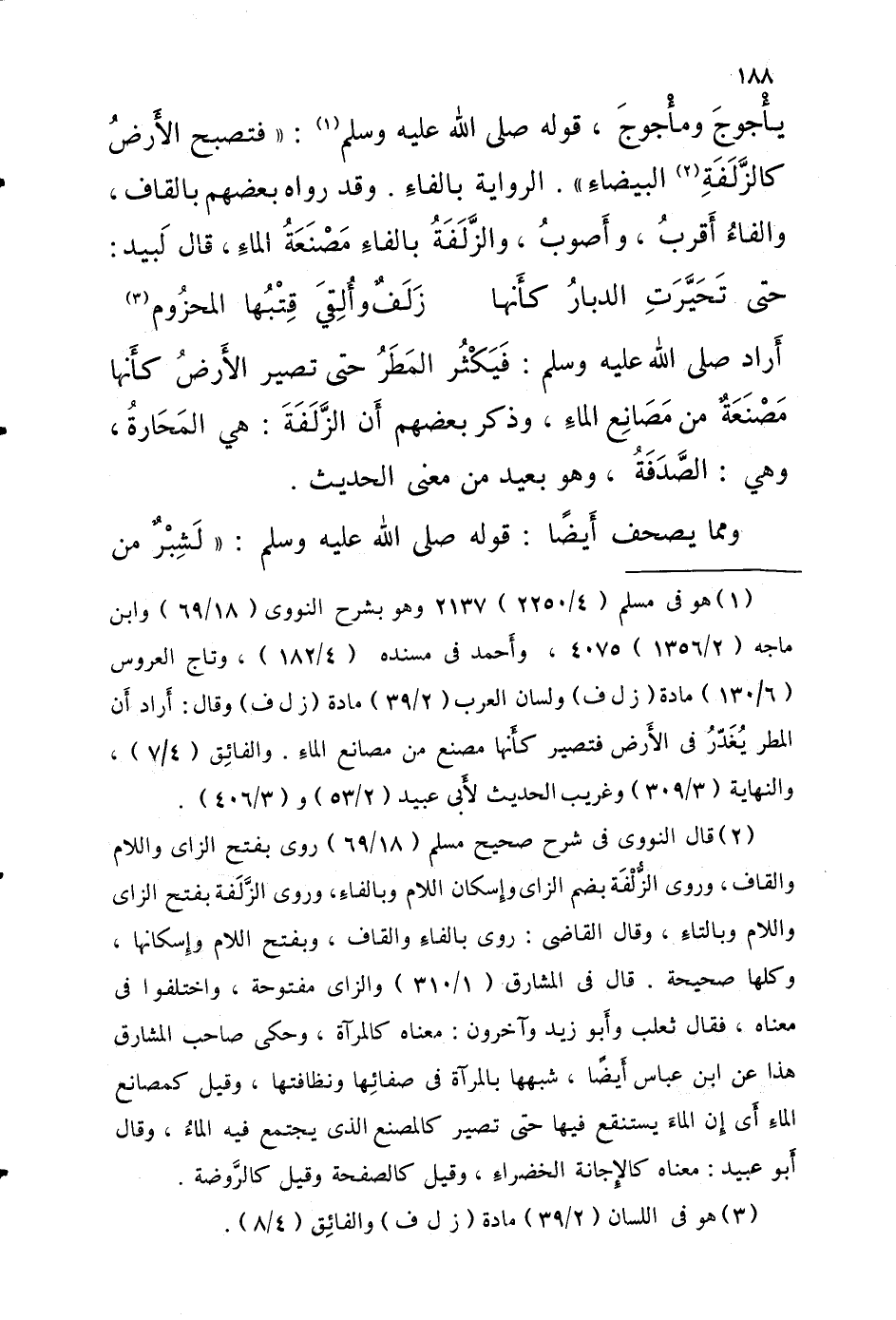 يَأْجُوج وَمَأْجُوج قَوْلِهِ صَلَّى اللَّهُ عَلَيْهِ وَسَلَّمَ فَتُصْبِح الأرضُ كالزَّلَفِةِ البيضاءِ الرِّوَايَة بالفاءِ وَقد رَواه بَعضهم بِالْقَافِ وَالْفَاء أقرب وأصوب والزَّلَفَةُ بالفاءِ مصْنَعَةُ الماءِ قالَ لَبيد