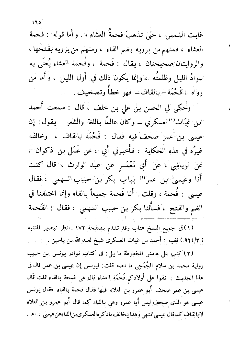 وَحَكَى لِي الْحَسَن بْن عَليّ بْن خلف قَالَ سَمِعت أَحْمد ابْن غياث العسكري وَكَانَ عَالما باللغة وَالشعر يَقُول إِن عِيسَى بْن عُمَر صحف فِيهِ فَقَالَ قَحْمَة بِالْقَافِ وَخَالفهُ غيرُه فِي هَذِهِ الْحِكَايَة فأَخبرني أَبِي عَن عَسَل بْن ذكْوَان عَن الرياشي عَن أَبِي معمرٍ عَن عَبْد الْوَارِث قالَ كنت أَنَا وَعِيسَى بْن عُمَر بِبَاب بكر بن حبيب السَّهْمِي فَقَالَ عِيسَى فَحْمَة وَقلت أَنَا فَحمة جَمِيعًا بالفاءِ وإِنما اخْتَلَفْنَا فِي الضَّم وَالْفَتْح فسألنا بَكْرُ بْنُ حَبِيبٍ السَّهَمِيُّ فَقَالَ الفَحمة