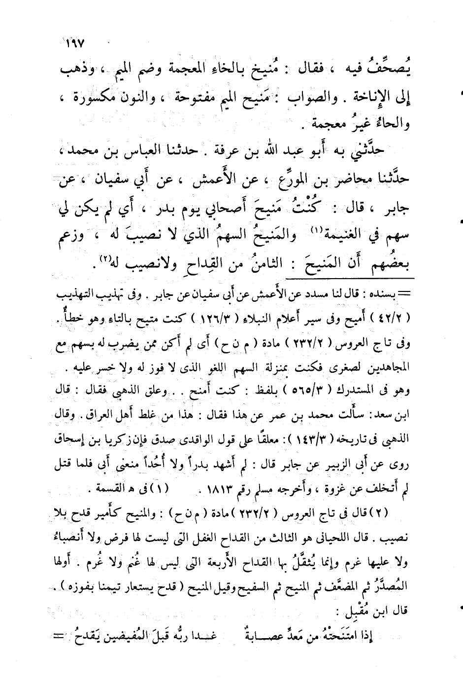 حَدَّثَنِي بِهِ أَبُو عَبْدِ اللَّهِ بْنُ عَرَفَةَ حَدَّثَنَا الْعَبَّاسُ بْنُ مُحَمَّدٍ حَدَّثَنَا مُحَاضِرُ بْنُ الْمُوَرِّعِ عَنِ الْأَعْمَشِ عَنْ أَبِي سُفْيَانَ عَنْ جَابِرٍ قَالَ كُنْتُ مَنِيحَ أَصْحَابِي يَوْمَ بَدْرٍ أَيْ لَمْ يَكُنْ لِي سَهْمٌ فِي الْغَنِيمَةِ وَالْمَنِيحُ السَّهْمُ الَّذِي لَا نَصِيبَ لَهُ وَزَعَمَ بْعَضُهُمْ أَنَّ الْمَنيحَ الثَّامِنُ مِنَ الْقِدَاحِ وَلا نَصِيبَ لَهُ