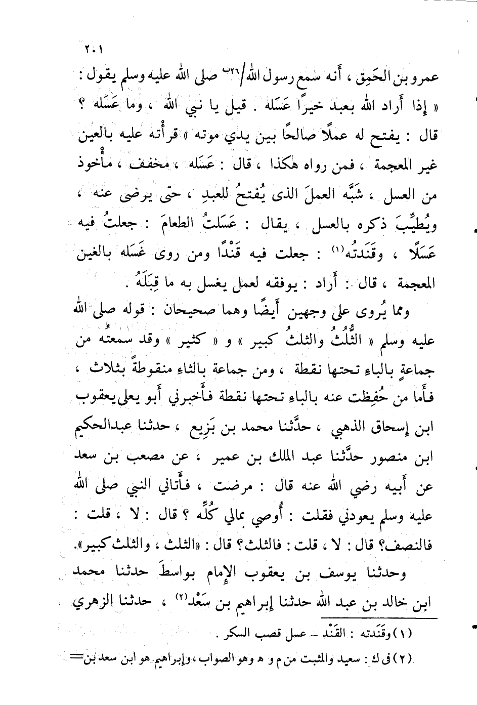 وَمِمَّا يُروى عَلَى وَجْهَيْن أَيْضا وهما صَحِيحَانِ قَوْله صلى الله عَلَيْهِ وَسلم الثُّلُثُ والثلثُ كَبِير وكثير وَقد سمعتُه من جماعةٍ بالباءِ تحتهَا نقطة وَمن جمَاعَة بالثاءِ منقوطةً بِثَلَاث فَأَما من حُفِظت عَنْهُ بالباءِ تحتهَا نقطة فَأَخْبَرَنِي أَبُو يَعْلَى يَعْقُوب ابْن إِسْحَاقَ الذَّهَبِيُّ حَدَّثَنَا مُحَمَّدُ بْنُ بزيع حَدثنَا عبد الحكم ابْن مَنْصُورٍ حَدَّثَنَا عَبْدُ الْمَلِكِ بْنُ عُمَيْرٍ عَنْ مُصْعَبِ بْنِ سَعْدٍ عَنْ أَبِيهِ رَضِيَ اللَّهُ عَنْهُ قَالَ مَرِضْتُ فَأَتَانِي النَّبِيُّ صَلَّى اللَّهُ عَلَيْهِ وَسَلَّمَ يَعُودُنِي فَقُلْتُ أُوصِي بِمَالِي كُلِّهِ قَالَ لَا قُلْتُ فَالنِّصْفُ قَالَ لَا قُلْتُ فَالثُّلُثُ قَالَ الثُّلُثُ وَالثُّلُثُ كَبِيرٌ