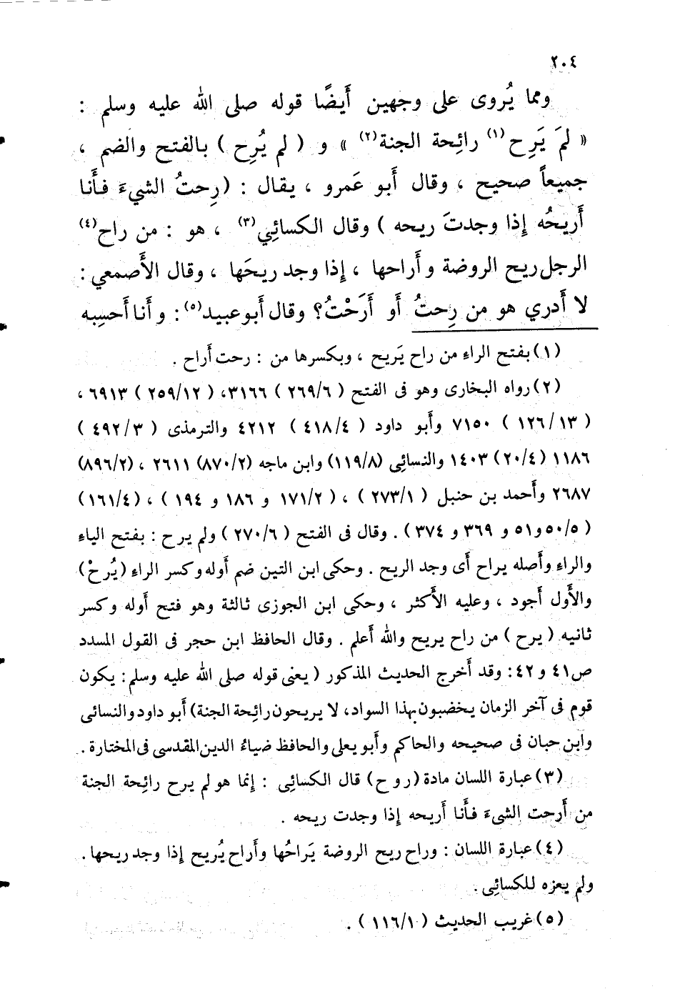 وَمِمَّا يُروى عَلَى وَجْهَيْن أَيْضا قَوْلِهِ صَلَّى اللَّهُ عَلَيْهِ وَسَلَّمَ لَم يَرِح رائِحة الْجنَّة و (لم يَرِح) بِالْفَتْح وَالضَّم جَمِيعًا صَحِيح وَقَالَ أَبُو عَمْرو يُقَالُ (رِحتُ الشيءَ فأَنا أَريحُه إِذا وجدتَ رِيحه) وَقَالَ الكسائِي هُوَ من رَاح الرجل ريح الرَّوْضَة وأَراحها إِذا وجد ريحَها وَقَالَ الْأَصْمَعِي لَا أَدري هُوَ من رِحتُ أَو أَرِحْتُ وَقَالَ أَبُو عُبَيْد وأَنا أَحسِبه