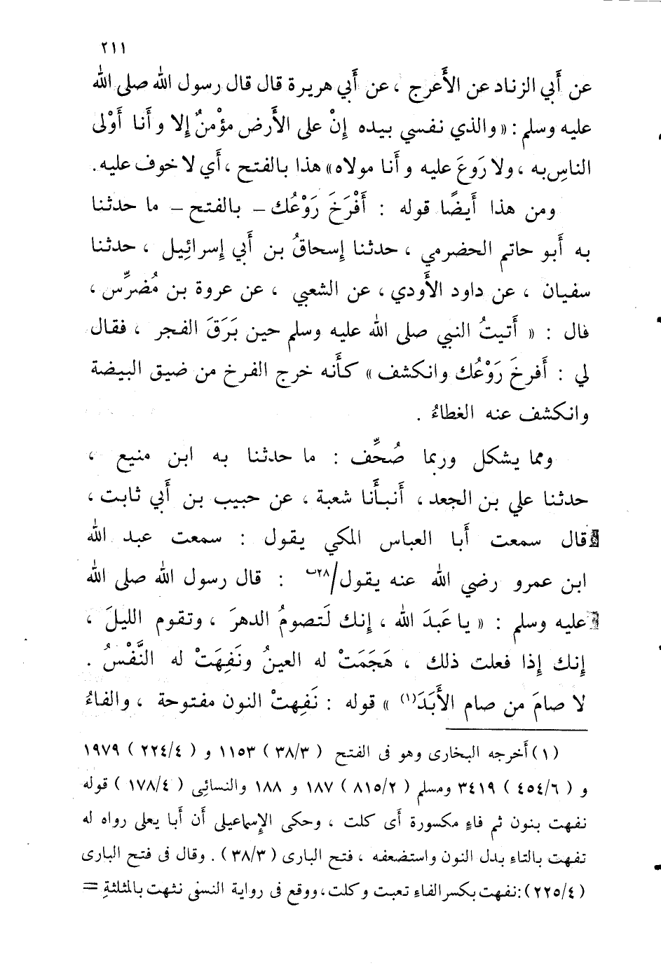 وَمِمَّا يشكل وَرُبمَا صُحِّف مَا حَدَّثَنَا بِهِ ابْنُ مَنِيعٍ حَدَّثَنَا عَلِيُّ بْنُ الْجَعْدِ أَنْبَأَنَا شُعْبَةُ عَنْ حَبِيبِ بْنِ أَبِي ثَابِتٍ قَالَ سَمِعْتُ أَبَا الْعَبَّاسِ الْمَكِّيَّ يَقُول سَمِعت عبد الله ابْن عَمْرٍو رَضِيَ اللَّهُ عَنْهُ يَقُولُ 28 ب قَالَ رَسُول اللَّهِ صَلَّى اللَّهُ عَلَيْهِ وَسَلَّمَ يَا عَبْدَ اللَّهِ إِنَّكَ لَتَصُومُ الدَّهْرَ وَتَقُومُ اللَّيْلَ انك اذا فعلت هَجَمَتْ لَهُ الْعَيْنُ وَنَفِهَتْ لَهُ النَّفْسُ لَا صَامَ مَنْ صَامَ الأَبَدَ قَوْله نَفِهتِ النُّون مَفْتُوحَة والفاءُ