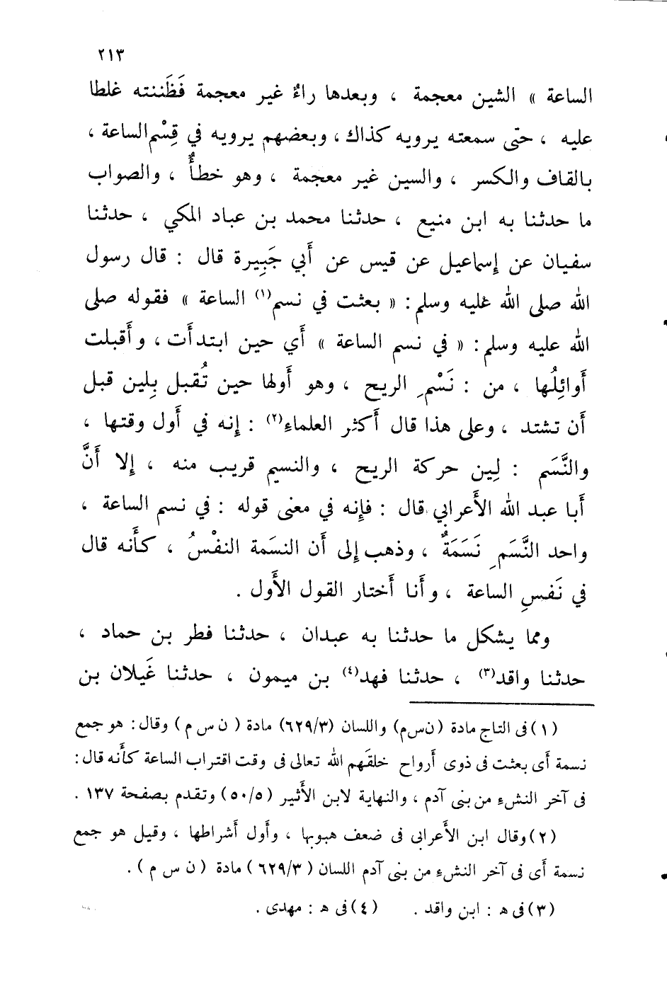 السَّاعَة الشين مُعْجمَة وَبعدهَا راءٌ غير مُعْجمَة فَظَننته غَلطا عَلَيْهِ حَتَّى سمعته يرويهِ كَذَاك وَبَعْضهمْ يرويهِ فِي قِسْم السَّاعَة بِالْقَافِ وَالْكَسْر وَالسِّين غير مُعْجمَة وَهُوَ خطأ وَالصَّوَاب مَا حَدَّثَنَا بِهِ ابْنُ مَنِيعٍ حَدَّثَنَا مُحَمَّدُ بْنُ عَبَّادٍ الْمَكِّيُّ حَدَّثَنَا سُفْيَانُ عَنْ إِسْمَاعِيلَ عَنْ قَيْسٍ عَنْ أَبِي جَبِيرَةَ قَالَ قَالَ رَسُولُ اللَّهِ صلى الله عَلَيْهِ وَسلم بُعثت فِي نَسَمِ السَّاعَةِ فَقَوْلُهُ صَلَّى اللَّهُ عَلَيْهِ وَسَلَّمَ فِي نَسَمِ السَّاعَةِ أَيْ حِينَ ابْتَدَأَتْ وَأَقْبَلَتْ أَوَائِلُهَا من نَسْمِ الرّيح وَهُوَ أَولها حِين تُقبل بِلين قبل أَن تشتد وعَلى هَذَا قالَ أَكثر العلماءِ إِنه فِي أَول وَقتهَا والنَّسَم لِين حَرَكَة الرّيح والنسيم قريب مِنْهُ إِلا أَنَّ أَبا عَبْد اللَّه الأَعرابي قالَ فإِنه فِي معنى قَوْله فِي نسم السَّاعَة وَاحِد النَّسَمِ نَسَمَةٌ وَذهب إِلى أَن النسَمة النفْسُ كأَنه قالَ فِي نَفسِ السَّاعَة وأَنا أَختار القَوْل الأَول