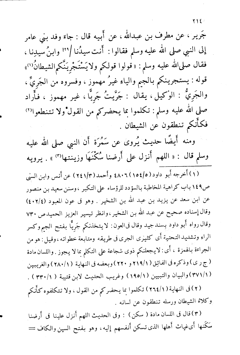 جَرِيرٍ عَنْ مُطَرِّفِ بْنِ عَبْدِ اللَّهِ عَنْ أَبِيهِ قَالَ جَاءَ وَفْدُ بَنِي عَامِرٍ إِلَى النَّبِيِّ صَلَّى اللَّهُ عَلَيْهِ وَسَلَّمَ فَقَالُوا أَنْت سيدنَا 29 أوَابْنُ سَيِّدِنَا فَقَالَ صَلَّى اللَّهُ عَلَيْهِ وَسَلَّمَ قُولُوا قَوْلَكُمْ وَلا يَسْتَجْرِيَنَّكُمُ الشَّيْطَانُ قَوْله يستجرينكم بِالْجِيم والياءِ غيرُ مَهْمُوز وفسروه من الجري والجري الْوَكِيل يُقَال جريت جَرِيًّا غير مَهْمُوز فأَراد صلى الله عَلَيْهِ وَسلم تكلمُوا بِمَا يحضركم من القَوْل وَلَا تتنطعوا فكأَنكم تنطقون عَن الشَّيْطَان