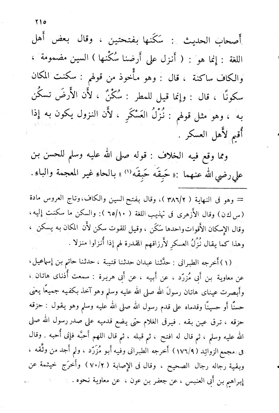 وَمِمَّا وَقع فِيهِ الْخلاف قَوْله صلى الله عَلَيْهِ وَسلم لِلْحسنِ بْن عَليّ رَضِيَ اللَّه عَنْهُمَا حَبِقَه حَبِقَه بالحاءِ غير الْمُعْجَمَة والباءِ