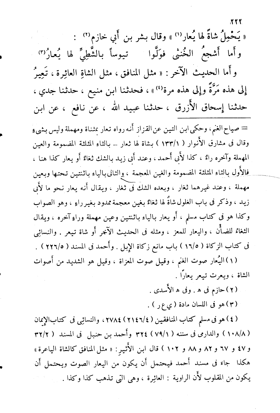 وأَما الحَدِيث الآخر مَثَلُ الْمُنَافِقِ مَثَلُ الشَّاةِ الْعَائِرَةِ تَعِيرُ إِلَى هَذِهِ مَرَّةً وَإِلَى هَذِهِ مَرَّةً فَحَدَّثَنَا ابْنُ مَنِيعٍ حَدَّثَنَا جَدِّي حَدَّثَنَا إِسْحَاقُ الأَزْرَقُ حَدَّثَنَا عُبَيْدُ اللَّهِ عَنْ نَافِعٍ عَنِ ابْنِ