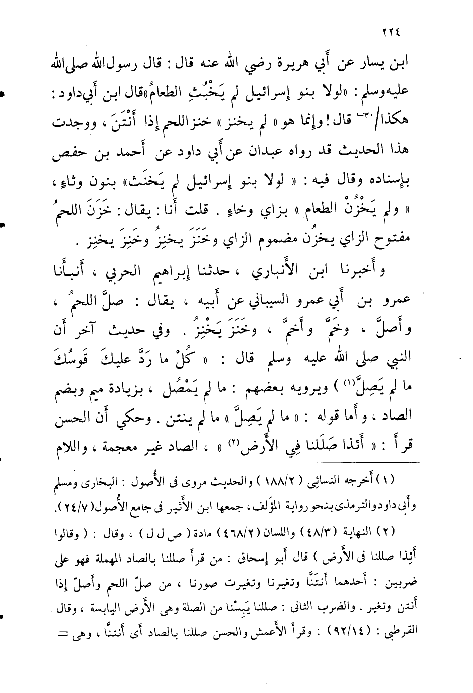 ابْن يَسَارٍ عَنْ أَبِي هُرَيْرَةَ رَضِيَ اللَّهُ عَنْهُ قَالَ قَالَ رَسُولُ اللَّهِ صَلَّى اللَّهُ عَلَيْهِ وَسَلَّمَ لَوْلا بَنُو إِسْرَائِيلَ لَمْ يَخْبُثِ الطَّعَامُ قالَ ابْن أَبي دَاوُد هَكَذَا 30 ب قالَ وإِنما هُوَ لم يخنز خنز اللَّحْم اذا أَنْتَنَ وَوجدت هَذَا الحَدِيث قد رَوَاهُ عَبْدَانِ عَن أَبي دَاوُد عَن أَحْمَد بْن حَفْص بإِسناده وَقَالَ فِيهِ لَوْلَا بَنو إِسرائيل لم يَخنَث بنُون وثاءٍ وَلم يَخْزُنُ الطَّعَام بزاي وخاءٍ قلتُ أَنا يُقَالُ خَزَنَ اللحمُ مَفْتُوح الزَّاي يخزُن مضموم الزَّاي وخَنَزَ يخنِزُ وخَنِزَ يخنِز