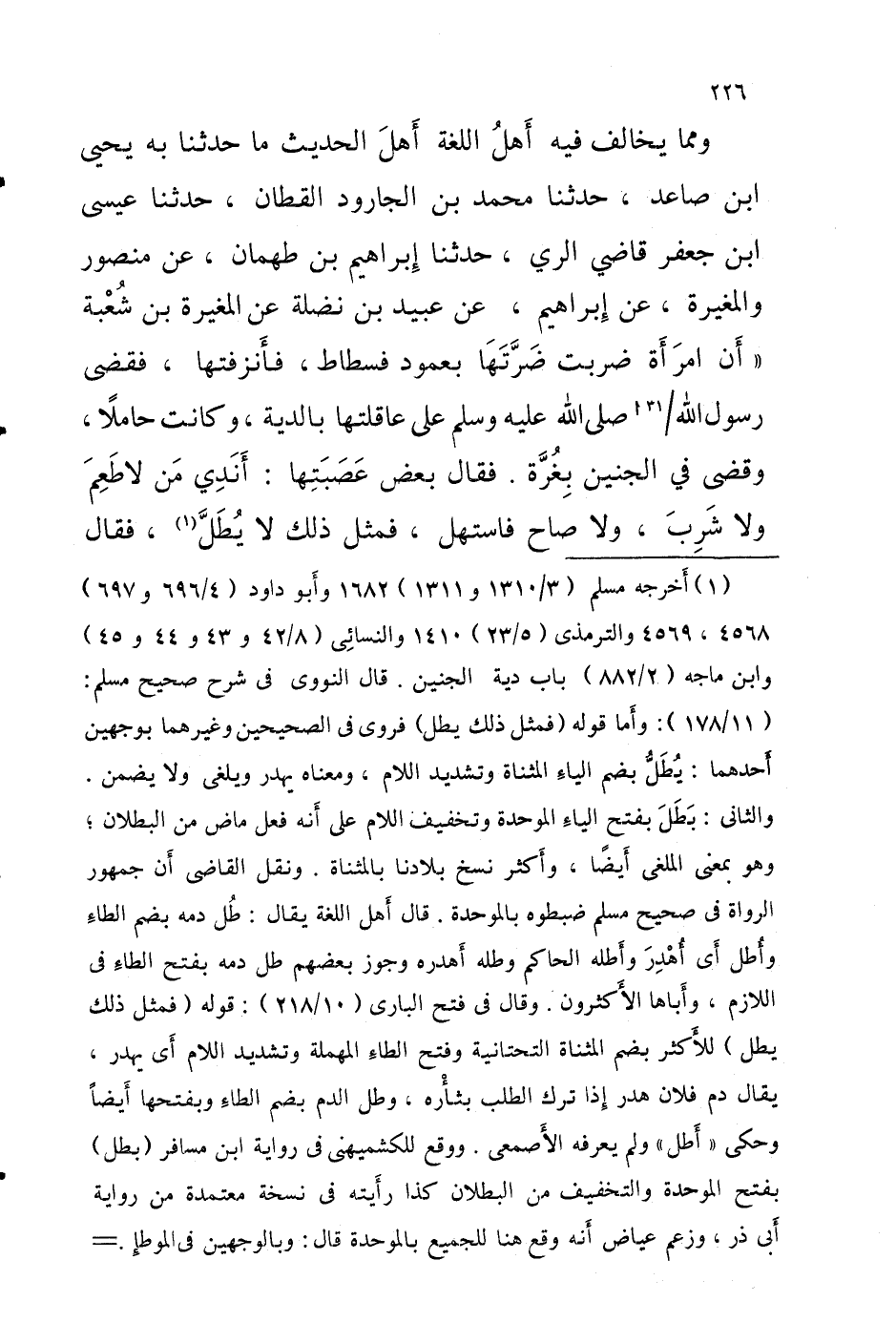 وَمِمَّا يُخَالف فِيهِ أَهل اللُّغَة أَهلَ الحَدِيث مَا حَدَّثَنَا بِهِ يحيى ابْنُ صَاعِدٍ حَدَّثَنَا مُحَمَّدُ بْنُ الْجَارُود الْقطَّان حَدثنَا عِيسَى ابْن جَعْفَرٍ قَاضِي الرَّيِّ حَدَّثَنَا إِبْرَاهِيمُ بْنُ طَهْمَانَ عَنْ مَنْصُورٍ وَالْمُغِيرَةِ عَنْ إِبْرَاهِيمَ عَنْ عُبَيْدِ بْنِ نَضْلَةَ عَنِ الْمُغِيرَةِ بْنِ شُعْبَةَ أَنَّ امْرَأَةً ضَرَبَتْ ضَرَّتَهَا بِعَمُودِ فُسْطَاطٍ فَأَنْزَفَتْهَا فَقَضَى رَسُولُ اللَّهِ 31 أصَلَّى اللَّهُ عَلَيْهِ وَسَلَّمَ عَلَى عَاقِلَتِهَا بِالدِّيَةِ وَكَانَتْ حَامِلًا وَقَضَى فِي الْجَنِينِ بِغُرَّةٍ فَقَالَ بَعْضُ عصبتها أندي من لاطعم وَلا شَرِبَ وَلا صَاحَ فَاسْتَهَلَّ فَمِثْلُ ذَلِكَ لَا يُطَلُّ فَقَالَ