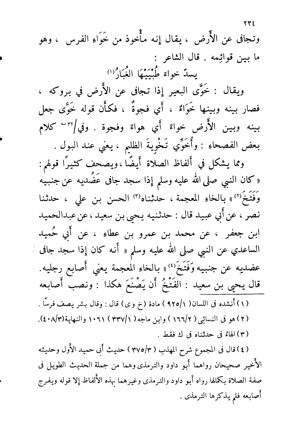 وَمِمَّا يشكل فِي أَلفاظ الصَّلَاة أَيضًا ويصحف كثيرا قَوْلهم كَانَ النَّبِيُّ صَلَّى اللَّهُ عَلَيْهِ وَسَلَّمَ إِذَا سَجَدَ جَافَى عَضُدَيْهِ عَنْ جَنْبَيْهِ وَفَتَخَ بالخاءِ الْمُعْجَمَة حَدَّثَنَاهُ الْحَسَنُ بْنُ عَلِيٍّ حَدَّثَنَا نَصْرٌ عَنْ أَبِي عُبَيْدٍ قَالَ حَدَّثَنِيهِ يَحْيَى بْنُ سَعِيدٍ عَنْ عَبْدِ الْحَمِيدِ ابْن جَعْفَرٍ عَنْ مُحَمَّدِ بْنِ عَمْرِو بْنِ عَطَاءٍ عَنْ أَبِي حُمَيْدٍ السَّاعِدِيِّ عَنِ النَّبِيِّ صَلَّى اللَّهُ عَلَيْهِ وَسَلَّمَ أَنَّهُ كَانَ إِذَا سَجَدَ جَافَى عَضُدَيْهِ عَنْ جَنْبَيْهِ وَفَتَخَ بالخاءِ الْمُعْجَمَة يَعْنِي أَصَابِع رجلَيْهِ قالَ يحيى بْن سَعِيد الفَتْخُ أَن يَصْنَعَ هَكَذَا وَنصب أَصابعه