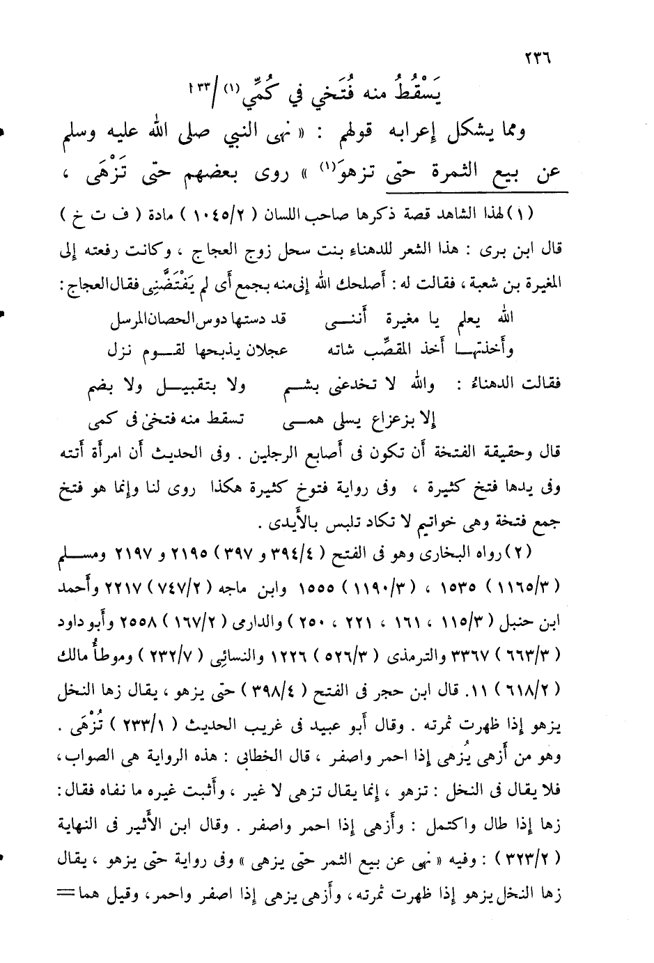 وَمِمَّا يشكل إعرابه قَوْلهم نهى النَّبِيَّ صَلَّى اللَّهُ عَلَيْهِ وَسَلَّمَ عَنْ بَيْعِ الثَّمَرِة حَتَّى تَزْهُوَ روى بَعضهم حَتَّى تَزْهَى