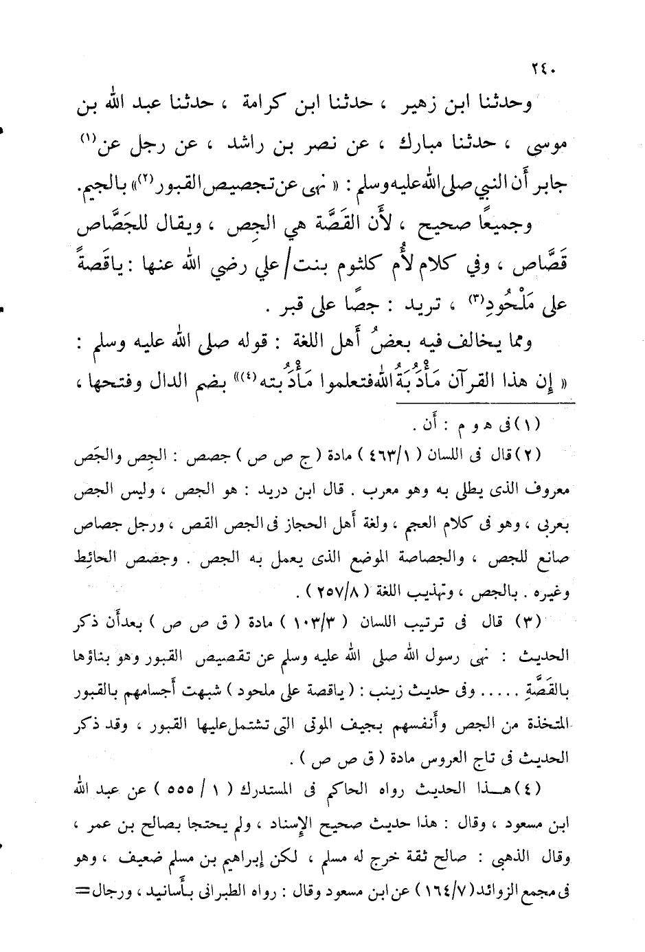 وَحَدَّثَنَا ابْنُ زُهَيْرٍ حَدَّثَنَا ابْنُ كَرَامَةَ حَدَّثَنَا عَبْدُ اللَّهِ بْنُ مُوسَى حَدَّثَنَا مُبَارَكٌ عَنْ نَصْرِ بْنِ رَاشِدٍ عَنْ رَجُلٍ عَنْ جَابِرٍ أَنّ النَّبِيَّ صَلَّى اللَّهُ عَلَيْهِ وَسَلَّمَ نَهَى عَنْ تَجْصِيصِ الْقُبُورِ بِالْجِيمِ