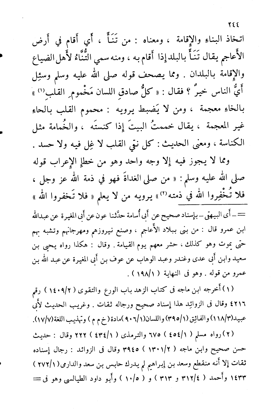 اتِّخَاذ البناءِ والإِقامة وَمَعْنَاهُ من تَنَأَ أَي أَقَامَ فِي أَرض الأَعاجم يُقَالُ تَنَأَ بِالْبَلَدِ إِذا أَقَامَ بِهِ وَمِنْه سمي التُّنَّاءُ لأَهل الضّيَاع وَالْإِقَامَة بالبلدان وَمِمَّا يصحف قَوْله صلى الله عَلَيْهِ وَسلم وسئِل أَيُّ النَّاس خيرٌ فَقَالَ كُلُّ صَادِقِ اللِّسَانِ مَخْمُومِ الْقَلْبِ بالخاءِ مُعْجمَة وَمن لَا يَضبط يرويهِ مَحْمُوم الْقلب بالحاءِ غير الْمُعْجَمَة يُقَالُ خممتُ البيتَ إِذا كنستَه والْخُمامة مثل الكناسة وَمعنى الحَدِيث كل نقي الْقلب لَا غِل فِيهِ وَلَا حسد