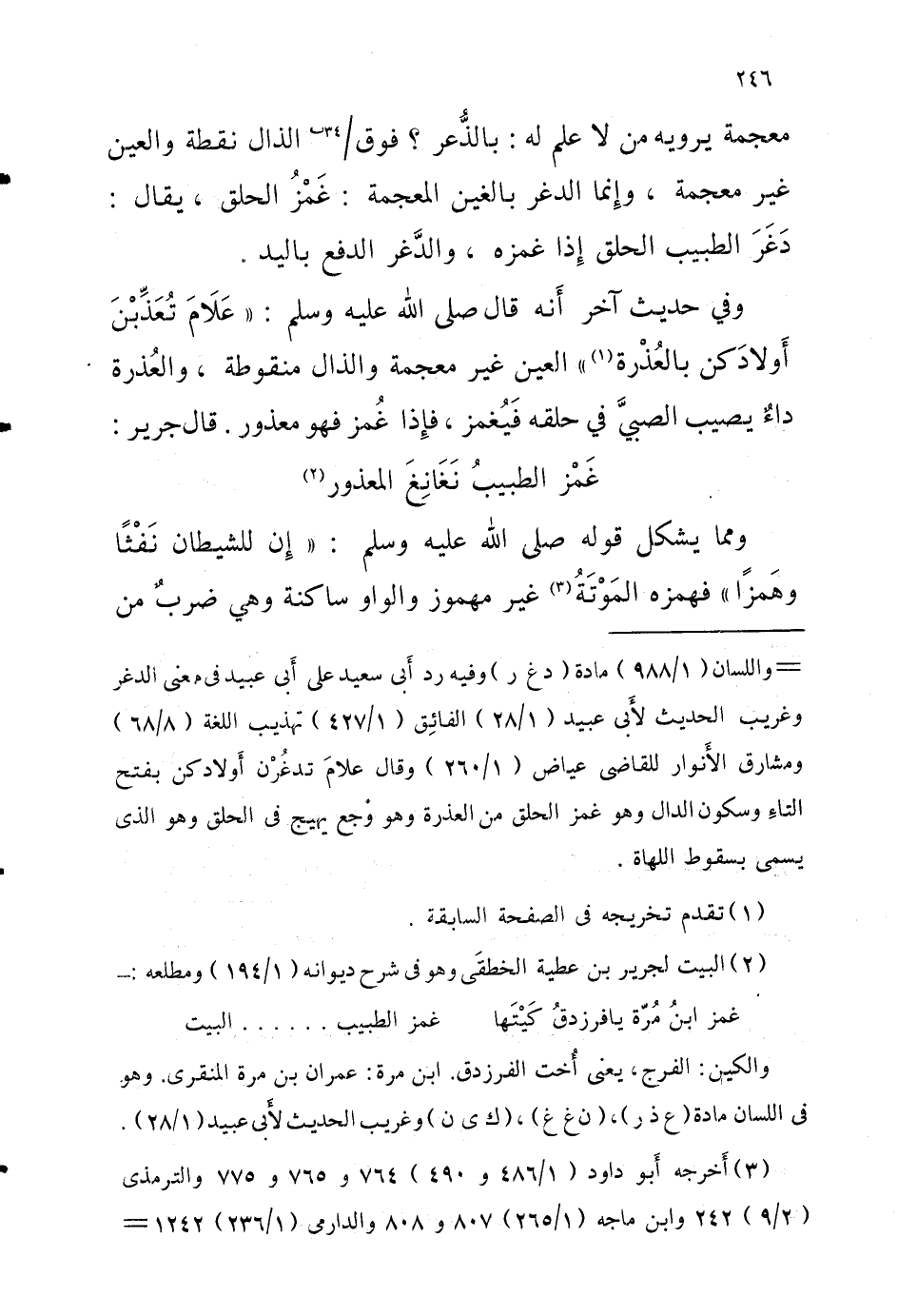 مُعْجمَة يرويهِ من لَا علم لَهُ بالذعر فَوق 34 ب الذَّال نقطة وَالْعين غير مُعْجمَة وإِنما الدغر بالغين الْمُعْجَمَة غَمْزُ الْحلق يُقَالُ دَغَرَ الطَّبِيب الْحلق إِذا غمزه والدَّغر الدّفع بِالْيَدِ