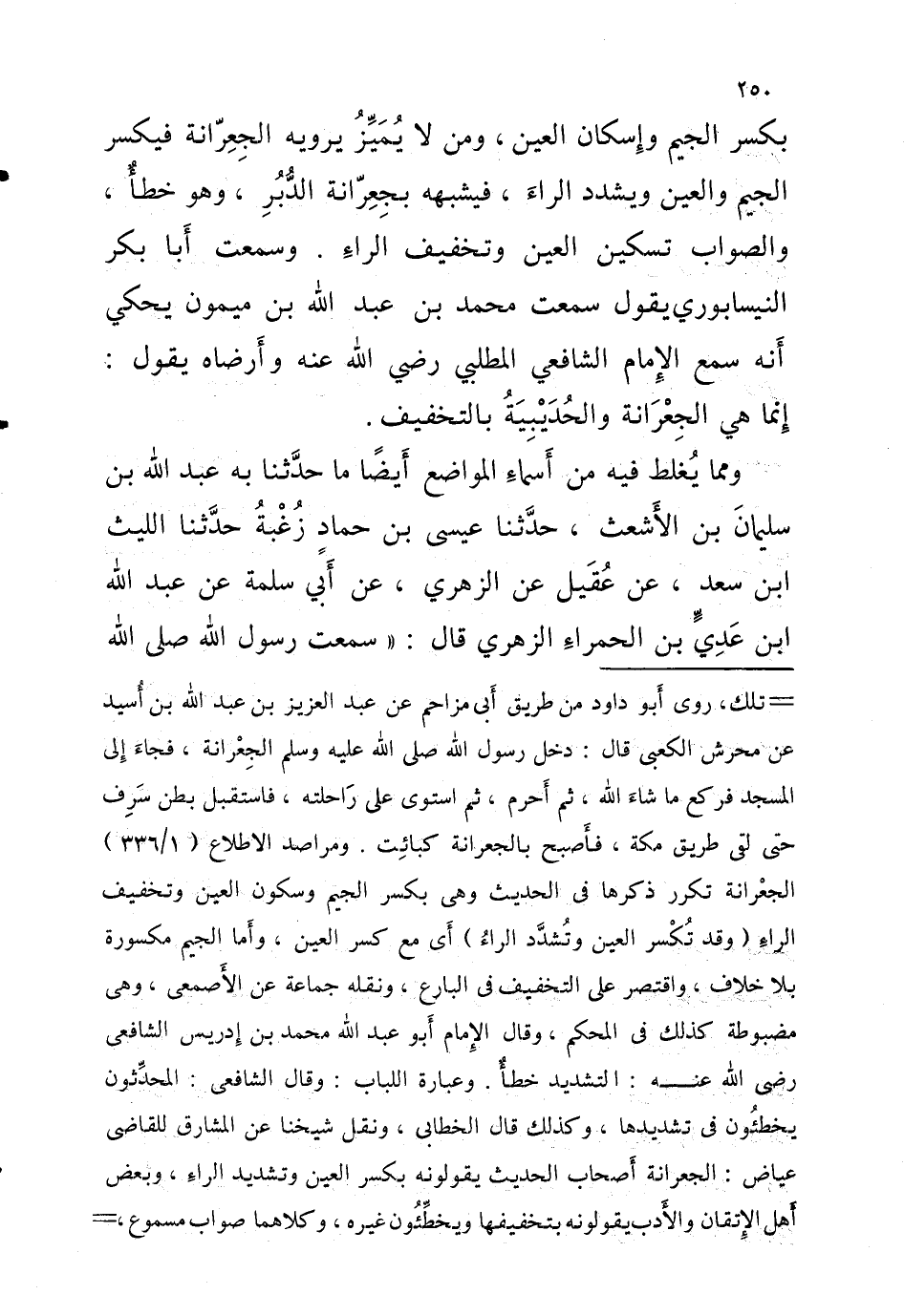بِكَسْر الْجِيم وإِسكان الْعين وَمن لَا يُمَيِّزُ يرويهِ الجِعرَانة فيكسر الْجِيم وَالْعين ويشدد الراءَ فيشبهه بجِعِرّانة الدُّبُرِ وَهُوَ خطأٌ وَالصَّوَاب تسكين الْعين وَتَخْفِيف الراءِ وَسمعت أَبا بَكْر النَّيْسابوريّ يَقُول سمعتُ مُحَمَّد بْن عَبْد اللَّه بْن مَيْمُون يَحْكِي أنَّه سمع الإِمام الشَّافِعِي المطلبي رَضِيَ اللَّه عَنْهُ وأَرضاه يَقُول إِنَّمَا هِيَ الجعْرانة والْحُدَيْبيَةُ بِالتَّخْفِيفِ