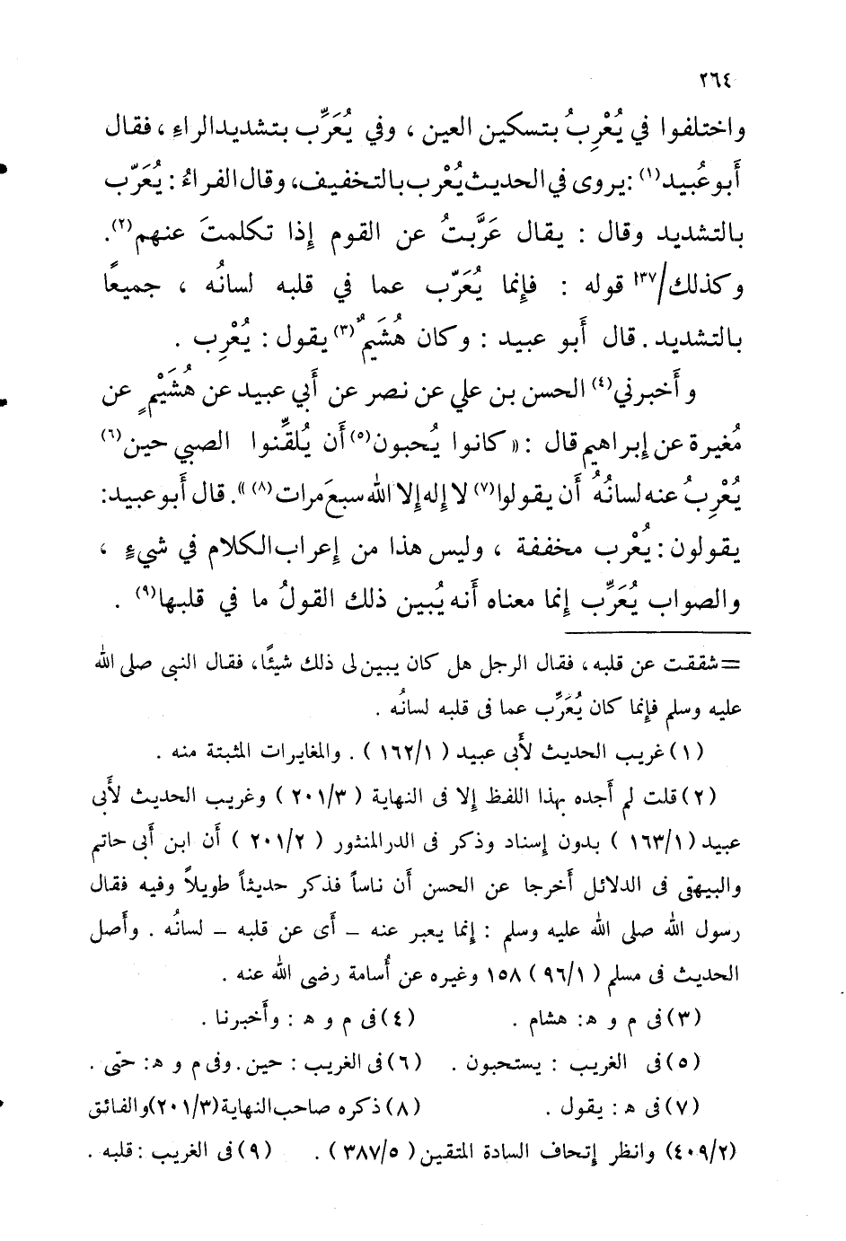 واخلتفوا فِي يُعْرِبُ بتسكين الْعين وَفِي يُعَرِّب بتَشْديد الراءِ فَقَالَ أَبُو عُبَيْد يرْوى فِي الحَدِيث يُعْرِب بِالتَّخْفِيفِ وَقَالَ الفراءُ يُعَرّب بِالتَّشْدِيدِ وَقَالَ يُقَالُ عَرَّبتُ عَن الْقَوْم اذا تَكَلَّمت عَنْهُم وَكَذَلِكَ 37 أقَوْله فَإِنَّمَا يُعَرّب عَمَّا فِي قلبه لِسَانه جَمِيعًا بِالتَّشْدِيدِ قالَ أَبُو عُبَيْد وَكَانَ هَشَيمٌ يَقُول يُعْرِب