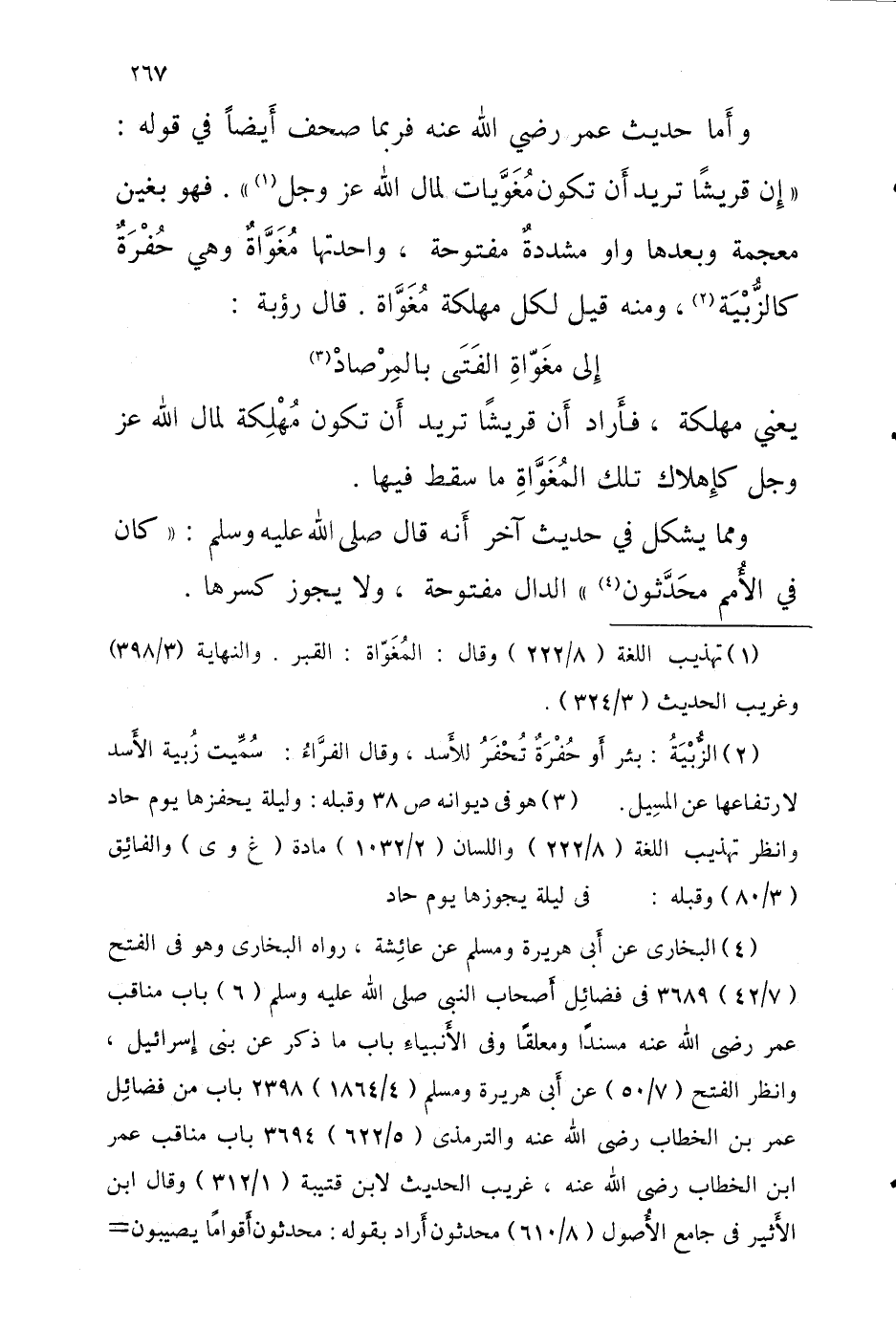 وأَما حَدِيث عُمَر رَضِيَ اللَّه عَنْهُ فَرُبمَا صحف أَيْضا فِي قَوْله إِنَّ قُرَيْشًا تُرِيدُ أَنْ تَكُونَ مُغَوَّيَاتٍ لِمَالِ اللَّهِ عَزَّ وَجَلَّ فَهُوَ بِغَيْن مُعْجمَة وَبعدهَا وَاو مشددةٌ مَفْتُوحَة واحدتها مُغَوَّاةٌ وَهِي حُفْرَةٌ كالزُّبْيَة وَمِنْه قيل لكل مهلكة مُغَوَّاة قالَ رؤبة