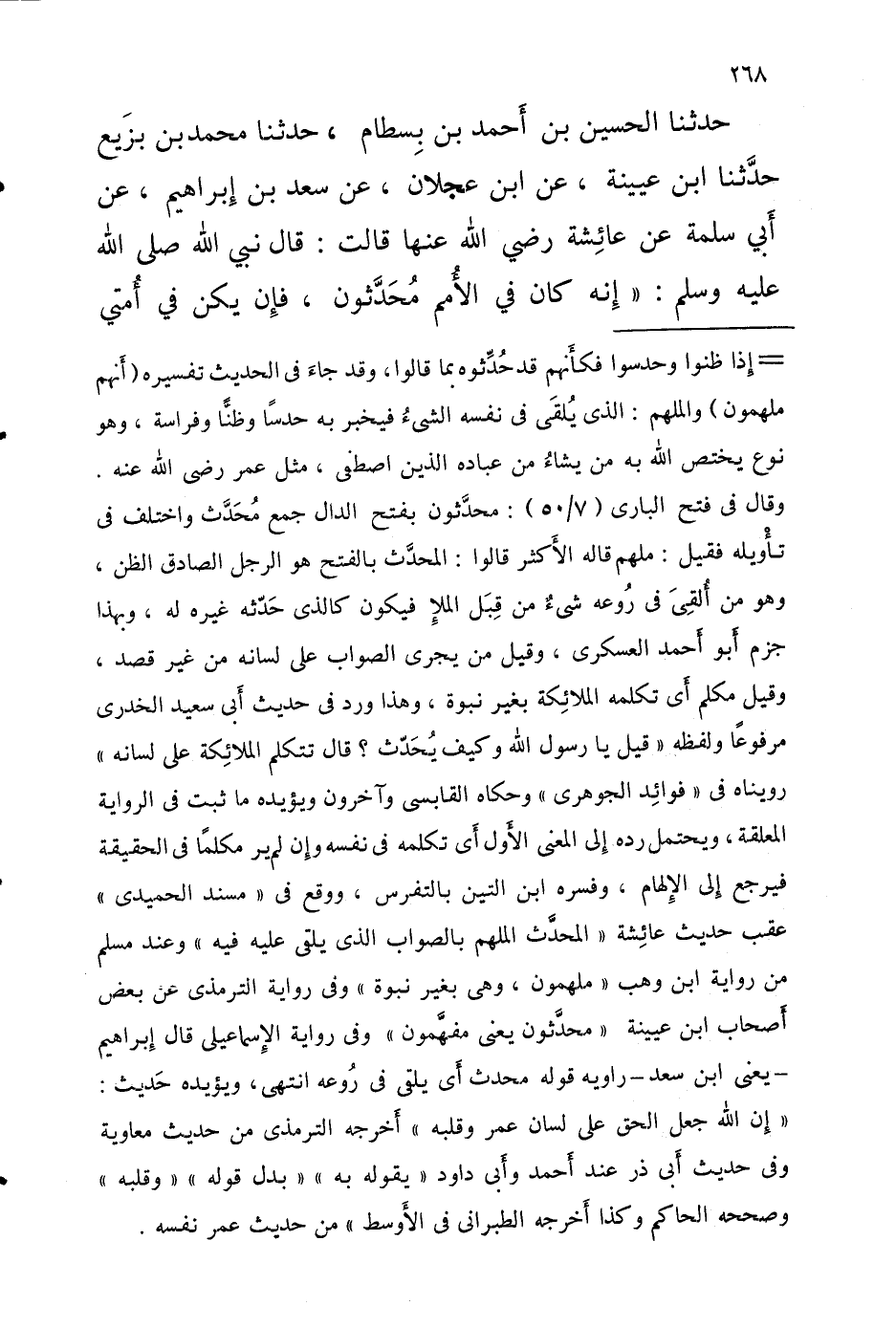 حَدَّثَنَا الْحُسَيْنُ بْنُ أَحْمَدَ بْنِ بِسْطَامٍ حَدَّثَنَا مُحَمَّدُ بْنُ بَزِيعٍ حَدَّثَنَا ابْنُ عُيَيْنَةَ عَنِ ابْنِ عجلَان عَن سعد إِبْرَاهِيمَ عَنْ أَبِي سَلَمَةَ عَنْ عَائِشَةَ رَضِيَ اللَّهُ عَنْهَا قَالَتْ قَالَ نَبِيُّ اللَّهِ صَلَّى اللَّهُ عَلَيْهِ وَسَلَّمَ إِنَّهُ كَانَ فِي الأُمَمِ مُحَدَّثُونَ فَإِنْ يَكُنْ فِي أُمَّتِي
