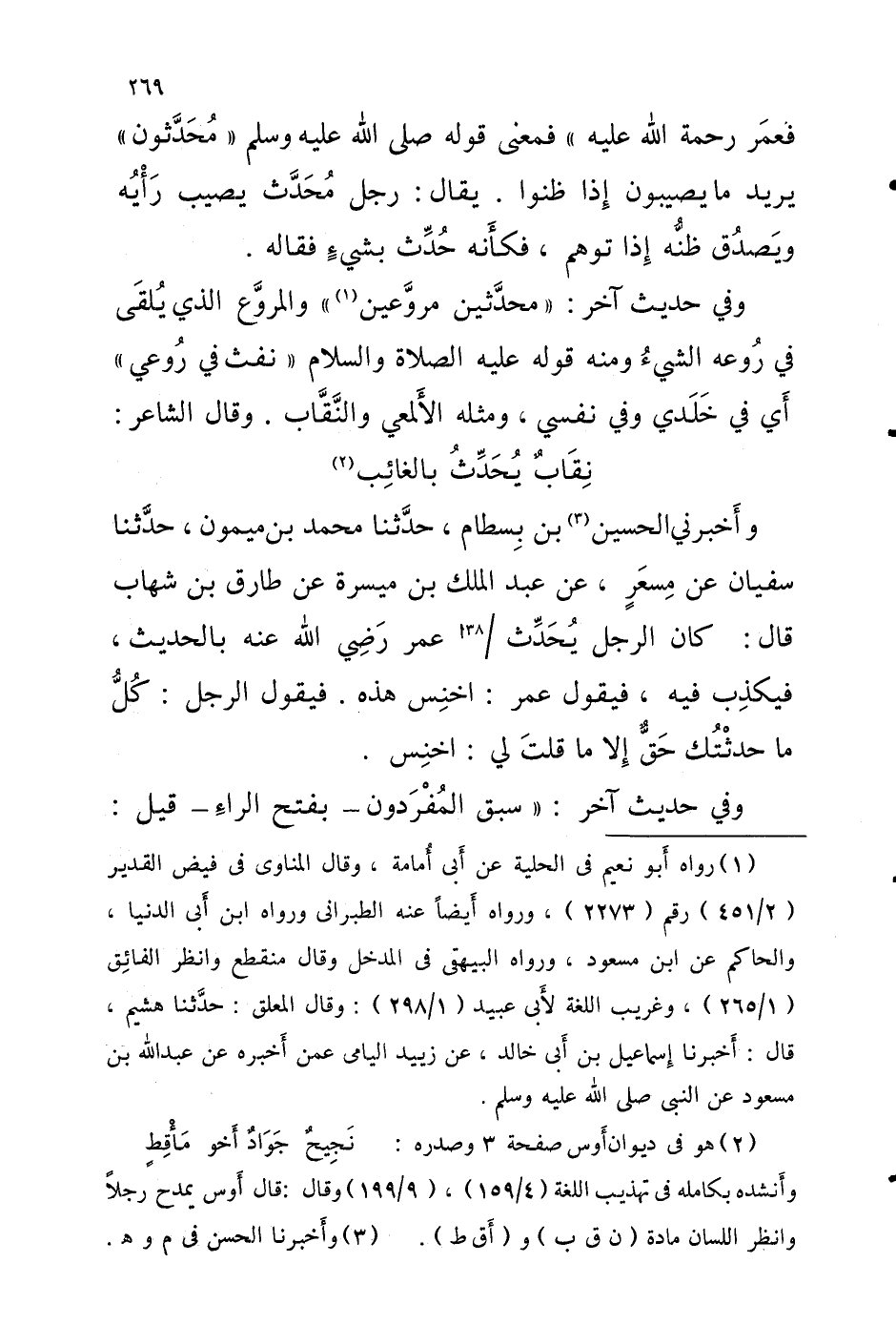 فَعُمَرُ رَحْمَةُ اللَّهِ عَلَيْهِ فَمَعْنَى قَوْلِهِ صَلَّى اللَّهُ عَلَيْهِ وَسَلَّمَ مُحَدَّثون يُرِيد مَا يصيبون إِذا ظنُّوا يُقَال رجل مُحدث يصيت رَأْيُه ويصَدُق ظنُّه إِذا توهم فَكَأَنَّهُ حُدِّث بشيءٍ فقاله