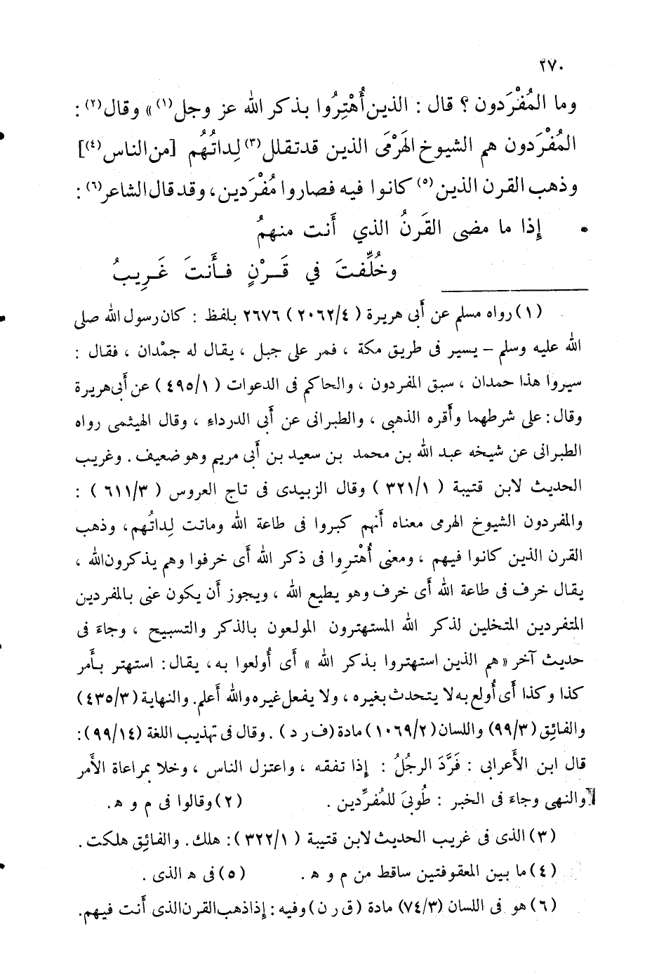 وَمَا الْمُفْرَدُونَ قَالَ الَّذِينَ أُهْتِرُوا بِذِكْرِ اللَّهِ عَزَّ وَجَلَّ وَقَالَ المُفْرَدون هُمُ الشُّيُوخ الَهرْمَى الَّذين قد تقلل لِداتُهُم [من النَّاس] وَذهب الْقرن الَّذين كَانُوا فِيه فصاروا مُفْرَدين وَقد قالَ الشَّاعِر