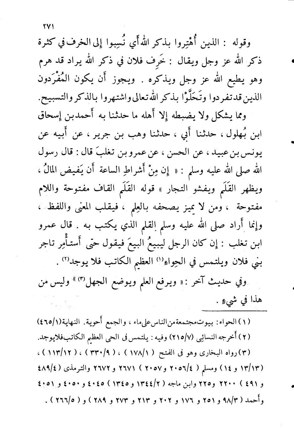 وَمِمَّا يشكل وَلَا يضبطه إِلا أَهله مَا حَدَّثَنَا بِهِ أَحْمَدُ بْنُ اسحاق ابْن بُهْلُولٍ حَدَّثَنَا أَبي حَدَّثَنَا وَهْبُ بْنُ جَرِيرٍ عَنْ أَبِيهِ عَنْ يُونُسَ بْنِ عُبَيْدٍ عَنِ الْحَسَنِ عَنْ عَمْرِو بْنِ تَغْلِبَ قَالَ قَالَ رَسُول اللَّهِ صَلَّى اللَّهُ عَلَيْهِ وَسَلَّمَ إِنَّ مِنْ أَشْرَاطِ السَّاعَةِ أَنْ يَفِيضَ الْمَالُ وَيَظْهَرَ الْقَلَمُ وَيَفْشُوَ التُّجَّارُ قَوْله القَلَم الْقَاف مَفْتُوحَة وَاللَّام مَفْتُوحَة وَمن لَا يُمَيّز يصحفه بالعلِم فيقلب الْمَعْنى وَاللَّفْظ وإِنما أَراد صلى الله عَلَيْهِ وَسلم الْقَلَم الَّذِي يكْتب بِهِ قَالَ عَمْرو ابْن تغلب إِن كَانَ الرجل ليبيعُ البيعَ فَيَقُول حَتَّى أَستأْمِر تَاجر بني فلَان ويلتمس فِي الحِواءِ الْعَظِيم الْكَاتِب فَلَا يُوجد