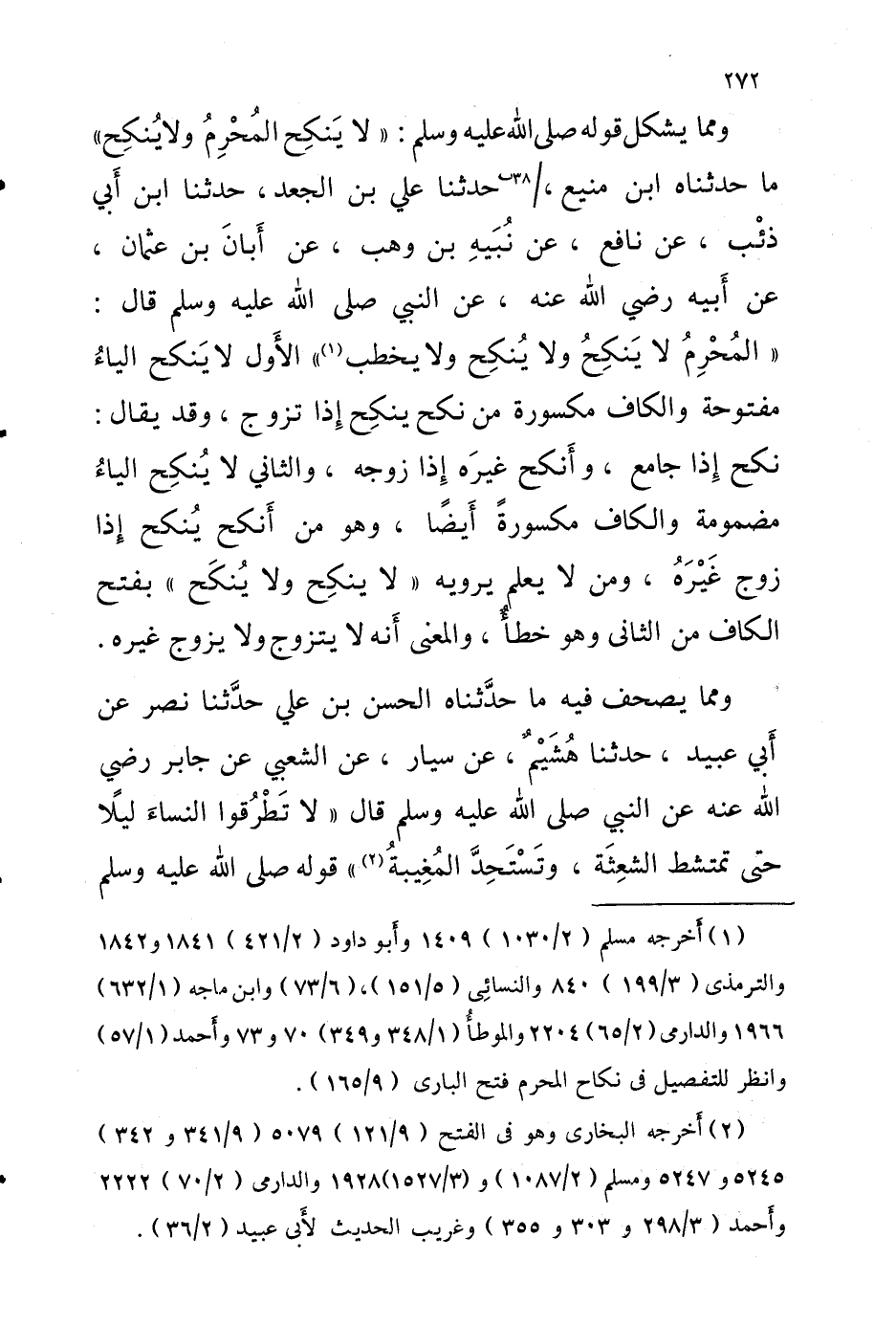 وَمِمَّا يشكل قَوْله صلى الله عَلَيْهِ وَسلم لَا يَنكِحُ الْمُحْرِمُ وَلا يُنْكِحُ مَا حَدَّثَنَاهُ ابْنُ منيع 38 ب حَدَّثَنَا عَلِيُّ بْنُ الْجَعْدِ حَدَّثَنَا ابْنُ أَبِي ذِئْبٍ عَنْ نَافِعٍ عَنْ نُبَيْهِ بْنِ وَهْبٍ عَنْ أَبَانَ بْنِ عُثْمَانَ عَنْ أَبِيهِ رَضِي عَنْهُ عَنِ النَّبِيِّ صَلَّى اللَّهُ عَلَيْهِ وَسَلَّمَ قَالَ الْمُحْرِمُ لَا يَنْكِحُ وَلا يُنكِحُ وَلا يَخْطُبُ الأَول لَا يَنكح الياءُ مَفْتُوحَة وَالْكَاف مَكْسُورَة من نكح ينكِح إِذا تزوج وَقد يُقَالُ نكح إِذا جَامع وأَنكح غيرَه إِذا روحه وَالثَّانِي لَا يُنكِح الياءُ مَضْمُومَة وَالْكَاف مَكْسُورَة أَيْضا وَهُوَ من أنكح ينْكح اذا زوح غَيْرَهُ وَمن لَا يعلم يرويهِ لَا ينكِح وَلَا يُنكَح بِفَتْح الْكَاف من الثَّانِي وَهُوَ خطأٌ وَالْمعْنَى أَنه لَا يتزوح وَلَا يُزَوّج غَيره