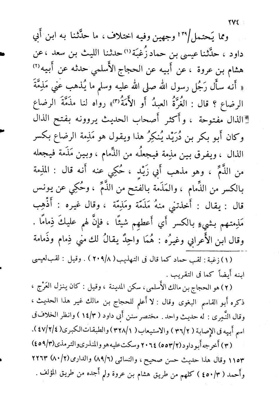وَمِمَّا يحْتَمل 39 أوَجْهَيْن وَفِيه اخْتِلَاف مَا حَدَّثَنَا بِهِ ابْنُ أَبِي دَاوُدَ حَدَّثَنَا عِيسَى بْنُ حَمَّادٍ زُغْبَةُ حَدَّثَنَا اللَّيْثُ بْنُ سَعْدٍ عَنْ هِشَامِ بْنِ عُرْوَةَ عَنْ أَبِيهِ عَنْ الْحَجَّاجِ الأَسْلَمِيِّ حَدَّثَهُ عَنْ أَبِيهِ أَنَّهُ سَأَلَ رَجُلٌ رَسُولَ اللَّهِ صلى الله عَلَيْهِ وَسلم مَا يُذْهِبُ عَنِّي مَذِمَّةَ الرَّضَاعِ قَالَ الْغُرَّةُ الْعَبْدُ أَوِ الأَمَةُ رَوَاهُ لَنَا مَذّمَّةَ الرَّضَاع الذَّال مَفْتُوحَة وأَكثر أَصحاب الحَدِيث يَرْوُونَهُ بِفَتْح الذَّال وَكَانَ أَبو بَكْر بْن دُرَيْد يُنكر هَذَا وَيَقُول هُوَ مَذِمة الرَّضَاع بِكَسْر الذَّال وَيفرق بَين مذمة فَيَجْعَلهُ من الذِّمام وَبَين مَذَمة فَيَجْعَلهُ من الذَّمِّ وَهُوَ مَذْهَب أَبي زَيْدٍ حُكِي عَنْهُ أَنه قالَ المذِمة بِالْكَسْرِ من الذِّمام والمذَمة بِالْفَتْح من الذَّم وَحكي عَن يُونُس قالَ يُقَالُ أخذتني مِنْهُ مذمة ومَذِمّة وَقَالَ غَيره أَذْهِب مَذِمتهم بشيءٍ بِالْكَسْرِ أَي أَعطِهم شَيْئا فإِنَّ لَهُم عليكَ ذِمامًا وَقَالَ ابْن الأَعرابي وغيرهُ هُمَا واحِدٌ يقالُ لَك مني ذِمام وذَمامة