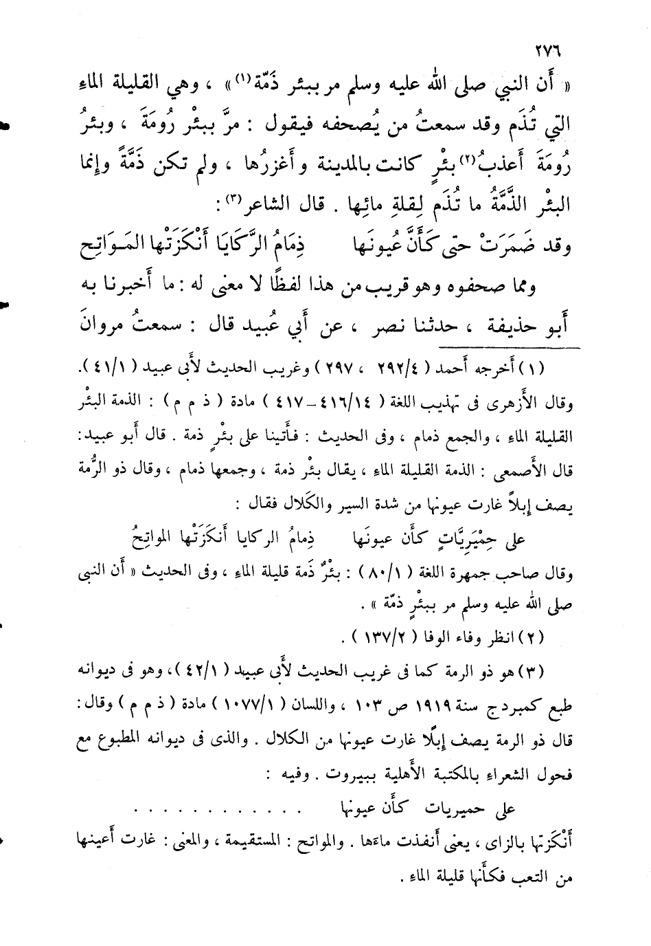 أَنّ النَّبِيَّ صَلَّى اللَّهُ عَلَيْهِ وَسلم مُرْ بِبِئْرِ ذَمَّةٍ وَهِي القليلة الماءِ الَّتِي تُذَم وَقد سمعتُ من يُصحفه فَيَقُول مرَّ ببئْر رُومَةَ وبئرُ رُومَةَ أَعذبُ بئْرٍ كَانَتْ بِالْمَدِينَةِ وأَغزرُها وَلم تكن ذَمَةً وإِنما البئْر الذَّمَّةُ مَا تُذَم لِقلةِ مائِها قالَ الشَّاعِر